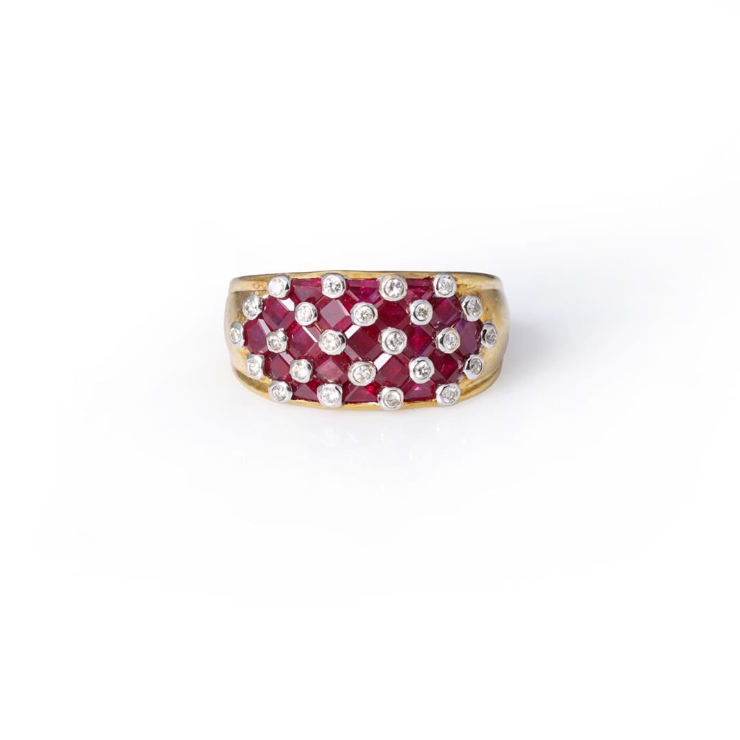 Numerous invisible set rubies interspersed with round bezel set diamond accents in white gold, the ring 18k yellow gold and marked 750; gross weight 7.8, size 6.5