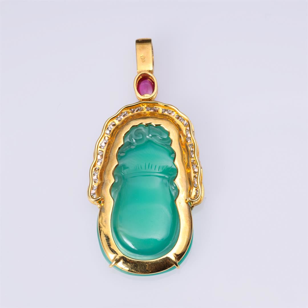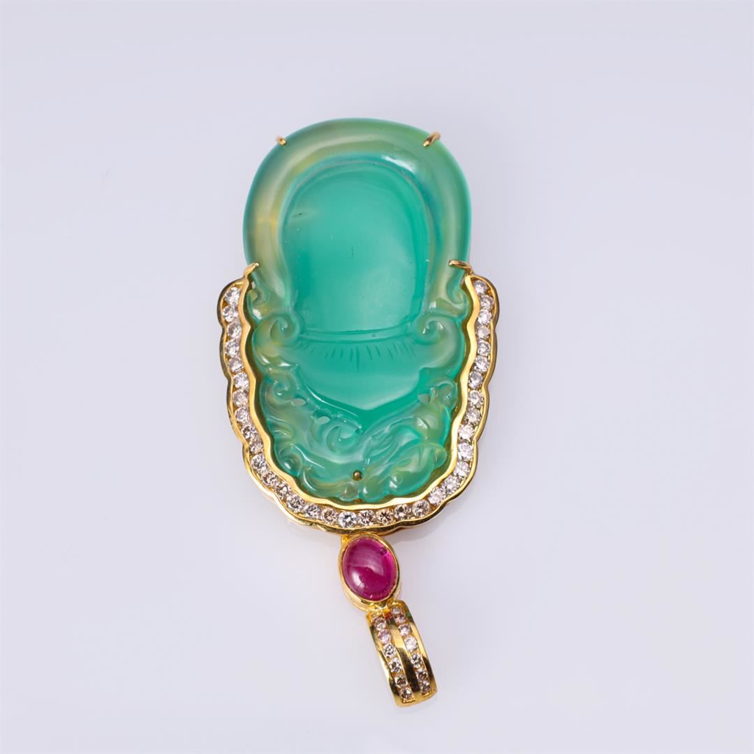 Usual Chinese carved green chalcedony mounted in 18k yellow gold pendant with ruby and diamonds, stamped 18k to bail; gross weight 12.1 g, H 2 1/4" x W 1 1/8" (approx.)