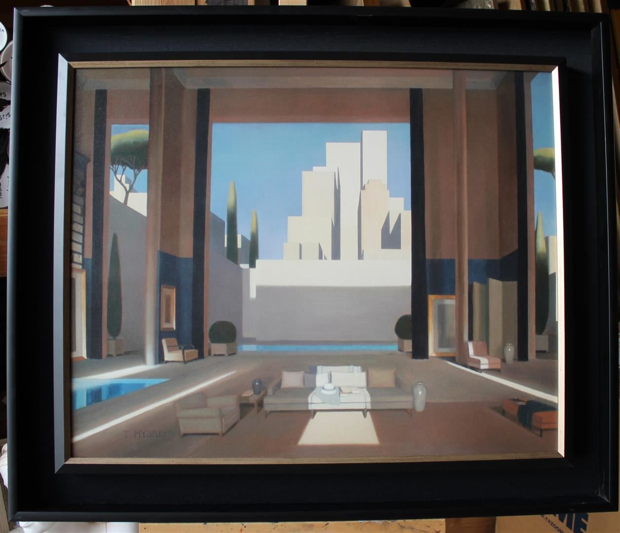 Indoor pools and upscale contemporary furniture provide a symbiotic relationship to the exquisite outdoor views, as depicted in French artist Thierry Mysius' oil on canvas. The painting measures 25.875 x 31.5; framed image measures approx. 37.875 x 43.5.