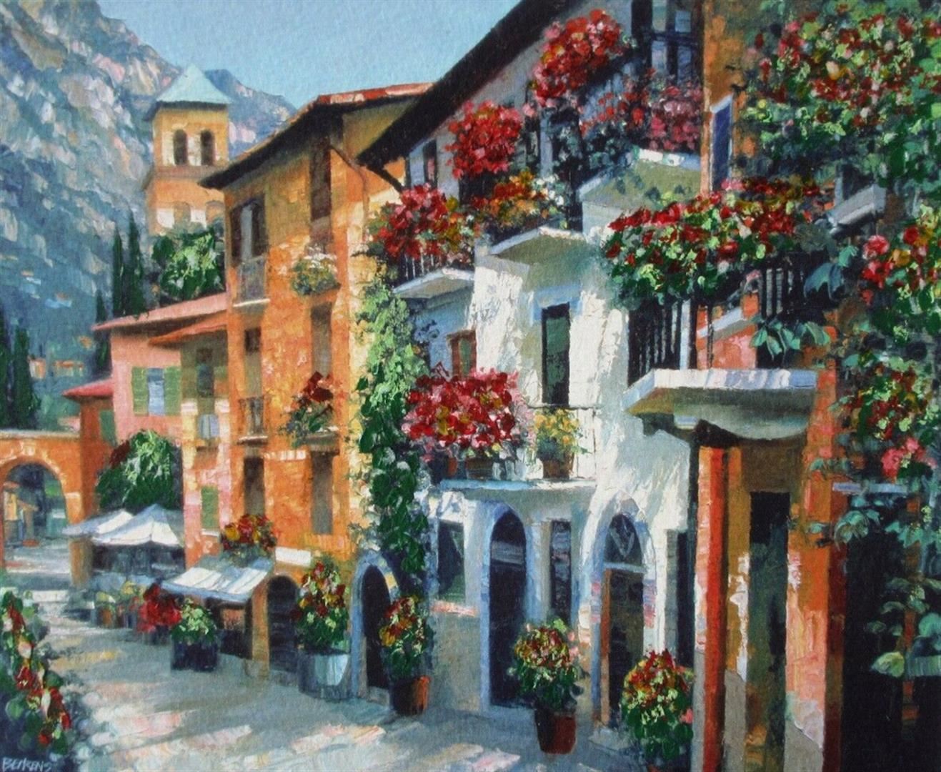VILLAGE HIDEAWAY by Behrens, Howard. Limited Hand Signed Heavily Embellished Stretched. Dimensions: 24 x 32. Excellent Condition.