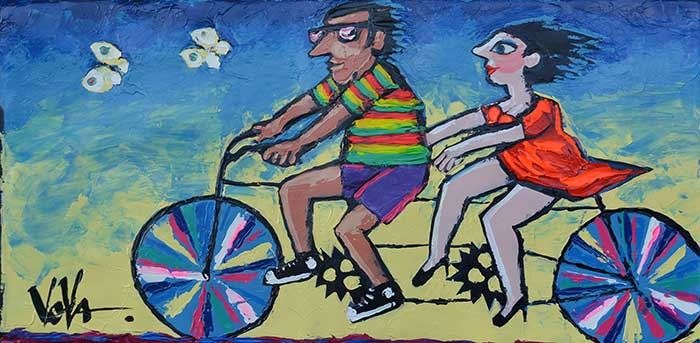 VLADIMIR "VOVA" MINGAR ** AGAINST THE WIND** ORIGINAL. Artist: Vladimir "Vova" Mingar - Title: Against the Wind - Medium: Original Acrylic on Canvas - Signature: This one-of-a-kind work is hand-signed by the artist at the bottom of the image - Image Size: Approximately 15 ½ inches x 29 ¾ inches - Framed: Unframed on Unstretched Canvas - Details: This work comes with a Certificate of Authenticity - Biography: Vladimir "Vova" Mingar was born in 1965 in a small Siberian town of Bodoebo. From an early age Vova was fascinated with art and loved drawing and creating clay sculptures, he took part in an art school special program for gifted and talented students. - One can describe Vova's style as expressionist abstractivism influenced by the CoBrA artistic movement, a style of art combining figurative primitivism and naivety with a shameless pinch of humour, and includes artists such as Cornielle, Karl Appel and an influential Lithuanian artist Leo Ray. The paints Vova uses are warm and robust, figures are bounded by black outlines, which creates a strong contrast. - Warranty: Item GUARANTEED to be as described