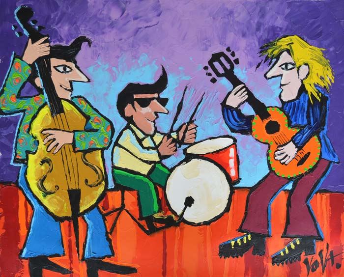 Artist: Vladimir "Vova" Mingar - Title: Untitled - Medium: Original Acrylic on Canvas - Signature: This one-of-a-kind work is hand-signed by the artist at the bottom of the image - Image Size: Approximately 24 inches x 30 inches - Unframed on Unstretched Canvas - Details: This work comes with a Certificate of Authenticity - Biography: Vladimir "Vova" Mingar was born in 1965 in a small Siberian town of Bodoebo. From an early age Vova was fascinated with art and loved drawing and creating clay sculptures, he took part in an art school special program for gifted and talented students. - One can describe Vova's style as expressionist abstractivism influenced by the CoBrA artistic movement, a style of art combining figurative primitivism and naivety with a shameless pinch of humour, and includes artists such as Cornielle, Karl Appel and an influential Lithuanian artist Leo Ray. The paints Vova uses are warm and robust, figures are bounded by black outlines, which creates a strong contrast. -