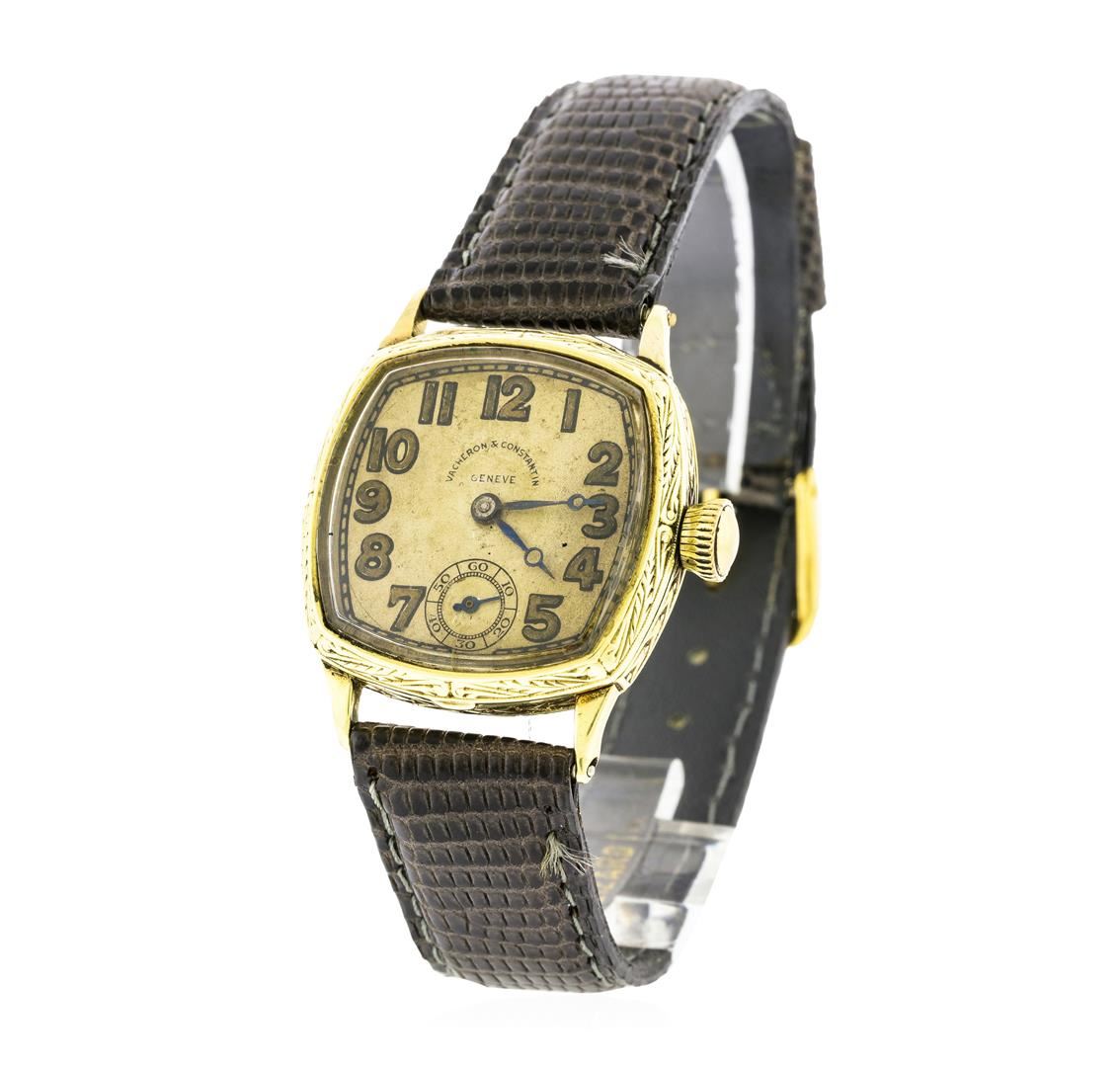 One, Vacheron Constantin wristwatch electronically tested 14KT Yellow gold, Case: 27mm x 27mm, Custom Case Back: space available for personalized engraving, Crown: scalloped, Bezel: patterned finish, Crystal: acrylic. Swiss Vacheron Constantin Movement: seventeen jewel mechanical with five position adjustments. Vacheron Constantin Signed Dial: Ivory color, with pointed hands, and numerals, Bracelet: saddle stitched leather strap, Condition: G-4 Average. Eight inch length, adjustable. Total Weight 28.30gm. AIG Appraised at $6,050.00.