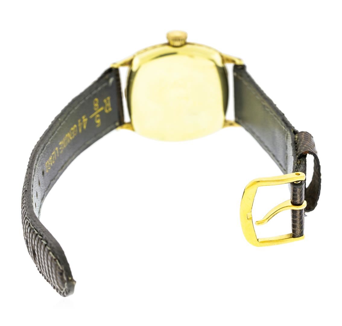 One, Vacheron Constantin wristwatch electronically tested 14KT Yellow gold, Case: 27mm x 27mm, Custom Case Back: space available for personalized engraving, Crown: scalloped, Bezel: patterned finish, Crystal: acrylic. Swiss Vacheron Constantin Movement: seventeen jewel mechanical with five position adjustments. Vacheron Constantin Signed Dial: Ivory color, with pointed hands, and numerals, Bracelet: saddle stitched leather strap, Condition: G-4 Average. Eight inch length, adjustable. Total Weight 28.30gm. AIG Appraised at $6,050.00.