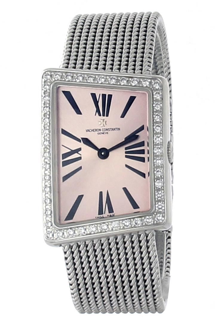 One Ladies 18K White Gold Vacheron Contantin, Serviced & Electronically Tested, Case:37mm 18K White Gold Case, White Gold Crown, Bezel: White Gold With Diamond Bezel, G In Color, Clarity: VS. Crystal: Sapphire Lens. Movement: Quartz Movement. Dial: Pink With Roman Hour Markers. 1.00cts of diamonds. Model#1972 Condition: G-6 Extra Fine. Band: White Gold Mesh Bracelet wit Hidden Clasp, 6.5 Inch Length, Adjustable.