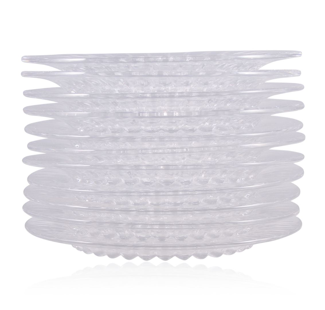 11 beautiful vintage crystal salad plates in great condition. Each plate measures 7 3/4" in diameter.