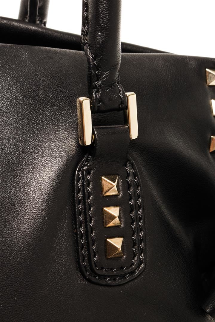 One Valentino Black Leather Bow Convertible Handbag. Item is sold AS-IS. All available information is listed in the description and shown in the photo. Valentino Black Leather Bow Convertible Handbag with gold-tone hardware, gold-tone metal bag foot, exterior rockstuds accents, exterior gold-tone valentino embossed logo, two bows at both sides black interior lining, three compartments with one compartment zipped, one interior zipper pocket, and dual rolled leather top handles. Height: 10 in (25.4 cm), Width: 4 in (10.16 cm), Depth: 12.5 in (31.75 cm)