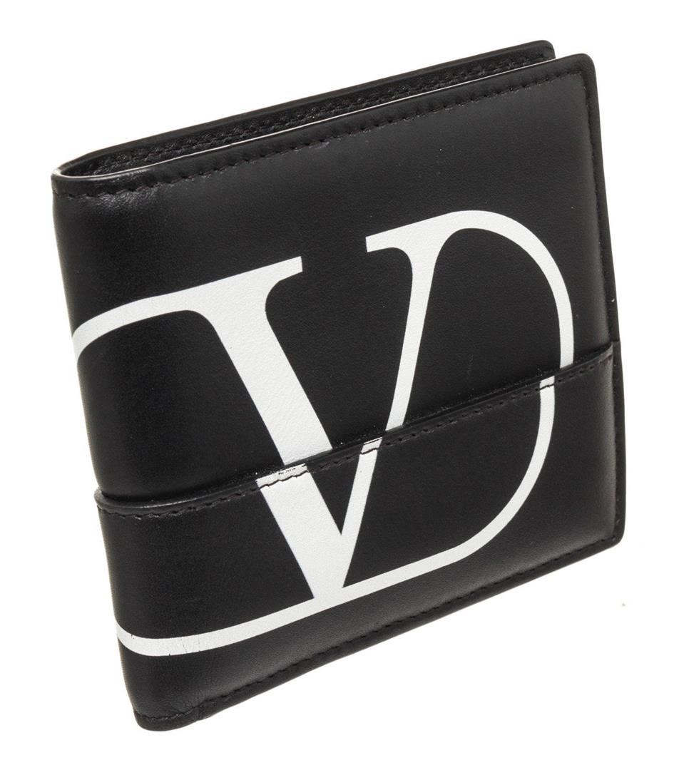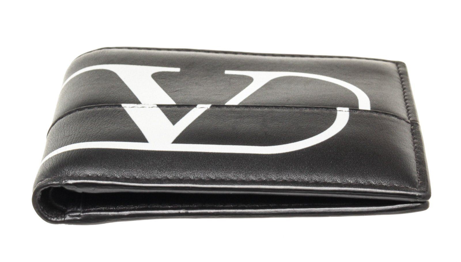 Valentino Black Leather Logo Print Bifold Wallet with leather gold-tone hardware, trim leather, interior slip pocket and flap closure.