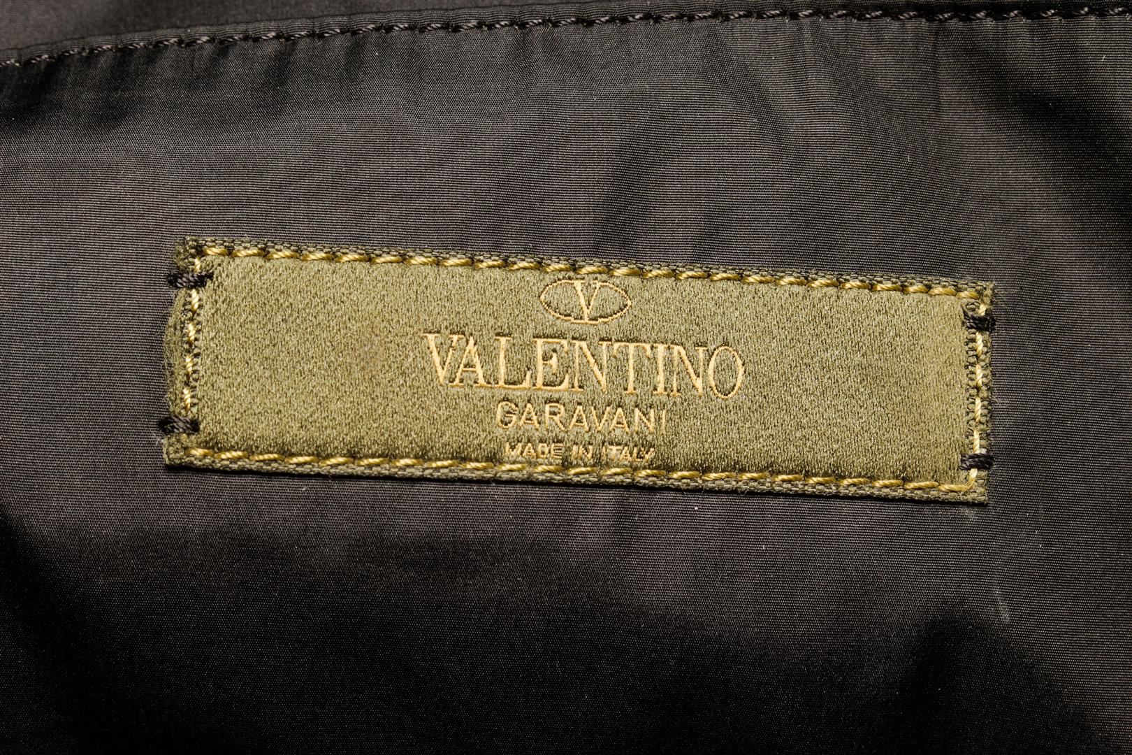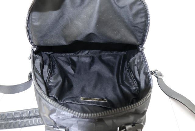 One Valentino Black Nylon Camustars Backpack. Item is sold AS-IS. All available information is listed in the description and shown in the photo. Valentino Camustars Backpack features black printed nylon with featuring zip fastening, gunmetal hardware, a front zipped pocket, leather adjustable shoulder straps and leather top handle. 13" x 16.1" x 8.3"