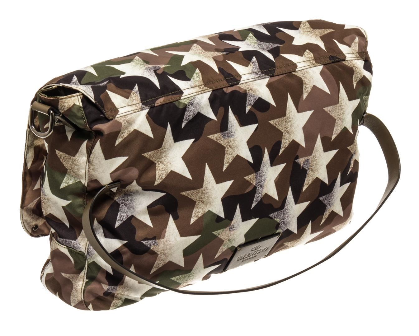 One Valentino Camouflage Camustars Messenger Bag. Item is sold AS-IS. All available information is listed in the description and shown in the photo. Valentino Camouflage Camustars Messenger Bag with shoulder strap, stars, nylon lining, interior zipper pocket, two slip pockets, snap closure.