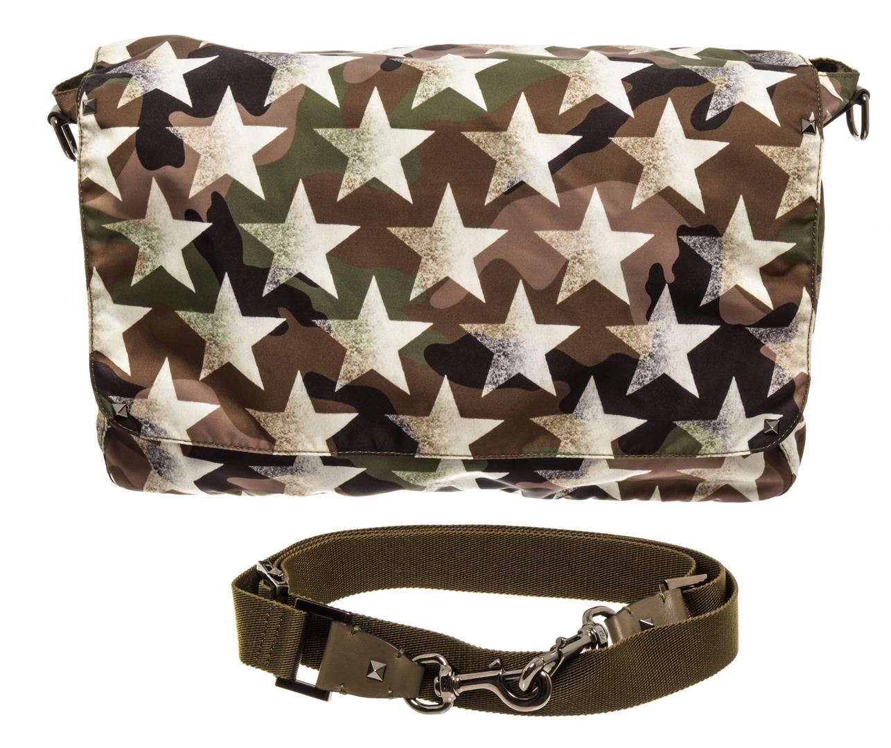 One Valentino Camouflage Camustars Messenger Bag. Item is sold AS-IS. All available information is listed in the description and shown in the photo. Valentino Camouflage Camustars Messenger Bag with shoulder strap, stars, nylon lining, interior zipper pocket, two slip pockets, snap closure.