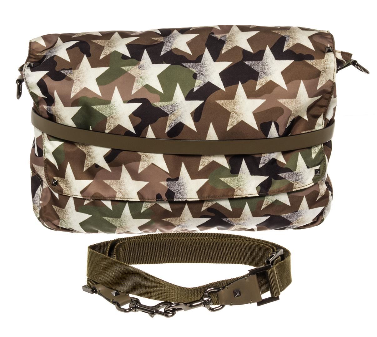 One Valentino Camustars Messenger Printed Camo Nylon Large Print. Item is sold AS-IS. All available information is listed in the description and shown in the photo. Valentino Camustars Messenger Printed Camo Nylon Large Print Condition Details: Small nick on strap base trim, creasing and light wear on exterior and in interior, scratches on hardware. Height 12", Width 17", Depth 4", Strap Drop 15-26