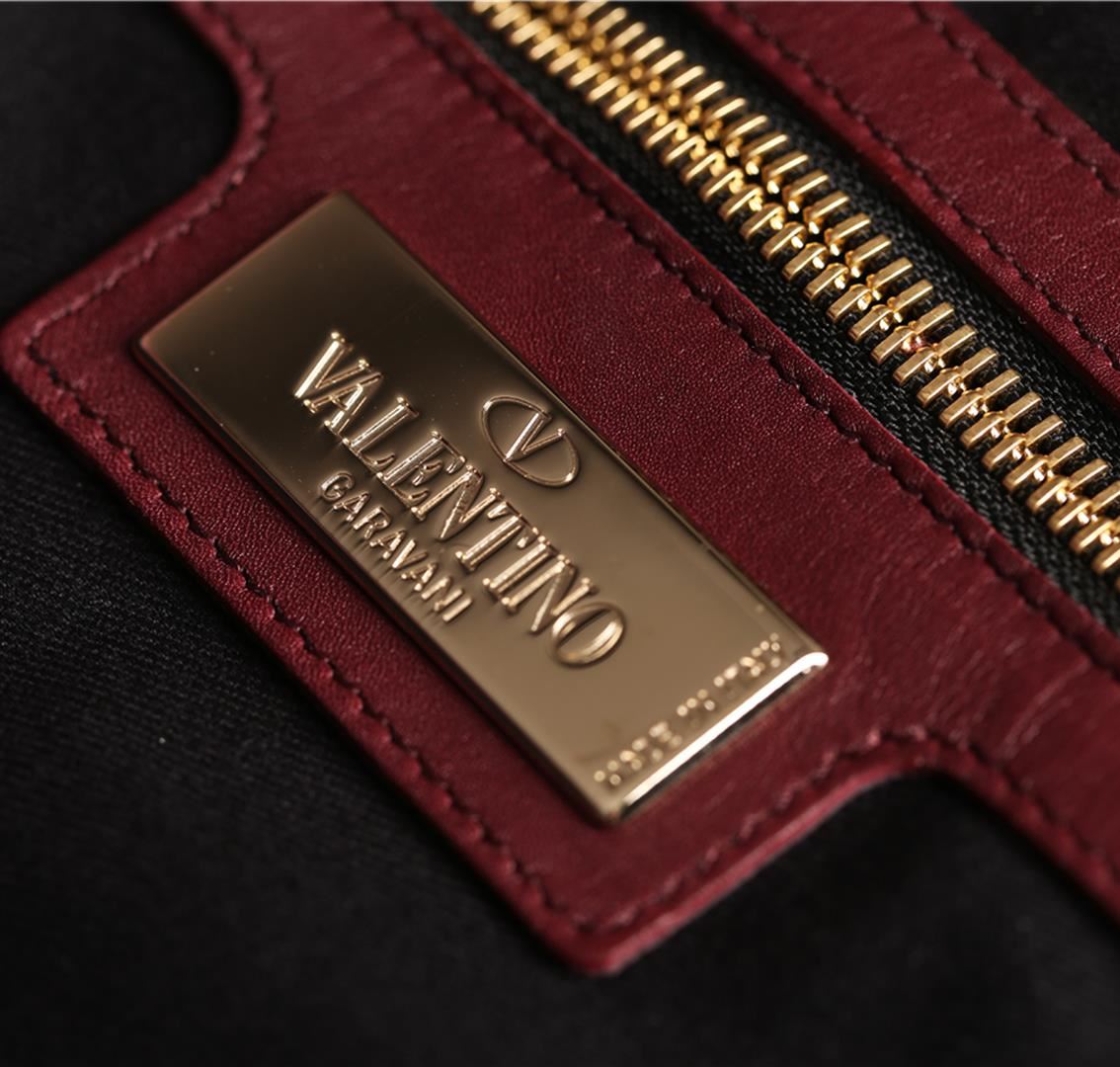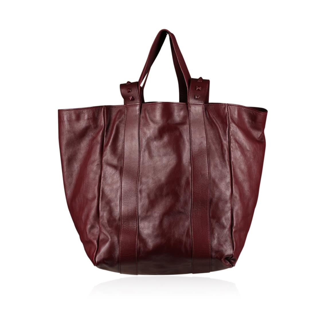 New with tags designer Valentino Burgundy color napa leather tote bag with 2 sets of double straps. Only one set with longer straps has burgundy rockstuds. The other set of shorter hand straps is smooth leather. Tote has fabric lining. Valentino metal inscribed metal plate inside handbag with one large zipper pouch inside. Inside the zipper pocket there are a few numbers and a letter written inside the zipper pocket. The leather is rich soft burgundy napa leather and beautiful. This is a very hard find, discontinued Valentino Garavani Tote Bag.