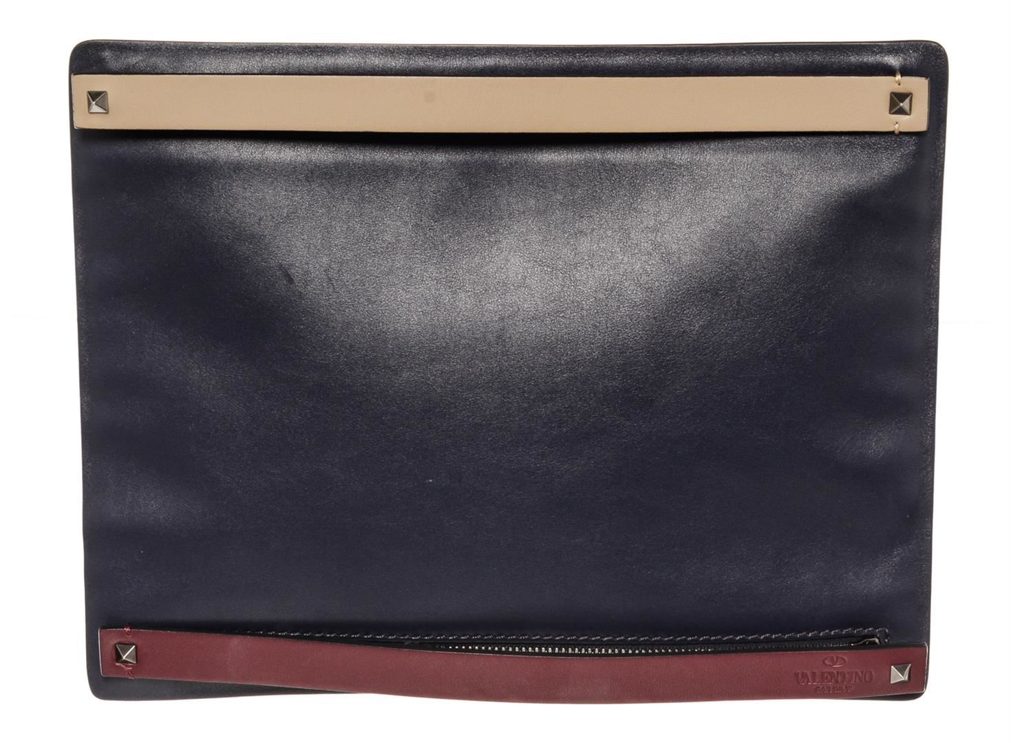 One Valentino Navy Blue Leather Double Zip Clutch. Item is sold AS-IS. All available information is listed in the description and shown in the photo. Navy blue leather Valentino Double Zip clutch with silver-tone hardware, two-tone handles crafted in beige and burgundy leather, stud adornments, dual zip closure and black canvas lining. W 30 in x H 7.8 in x D 0.3 in