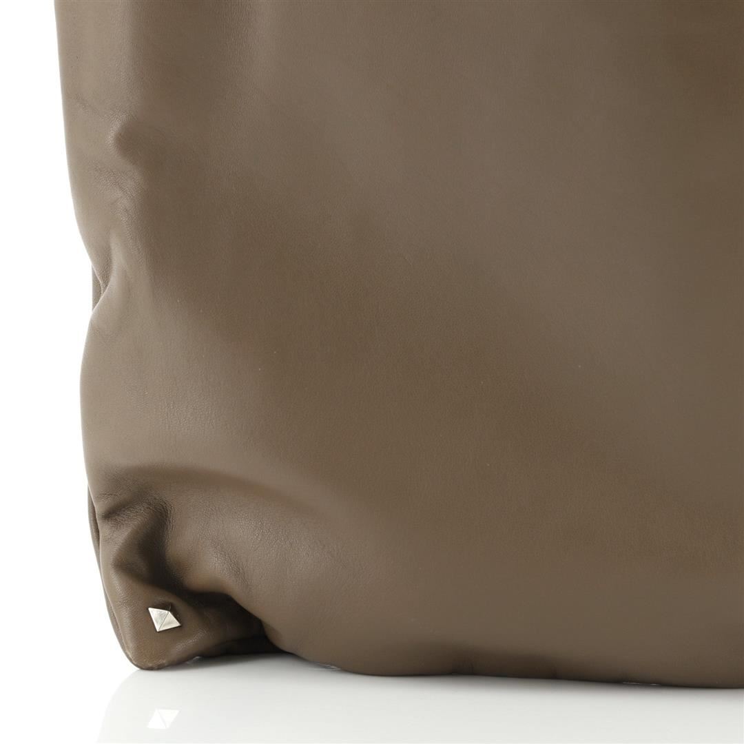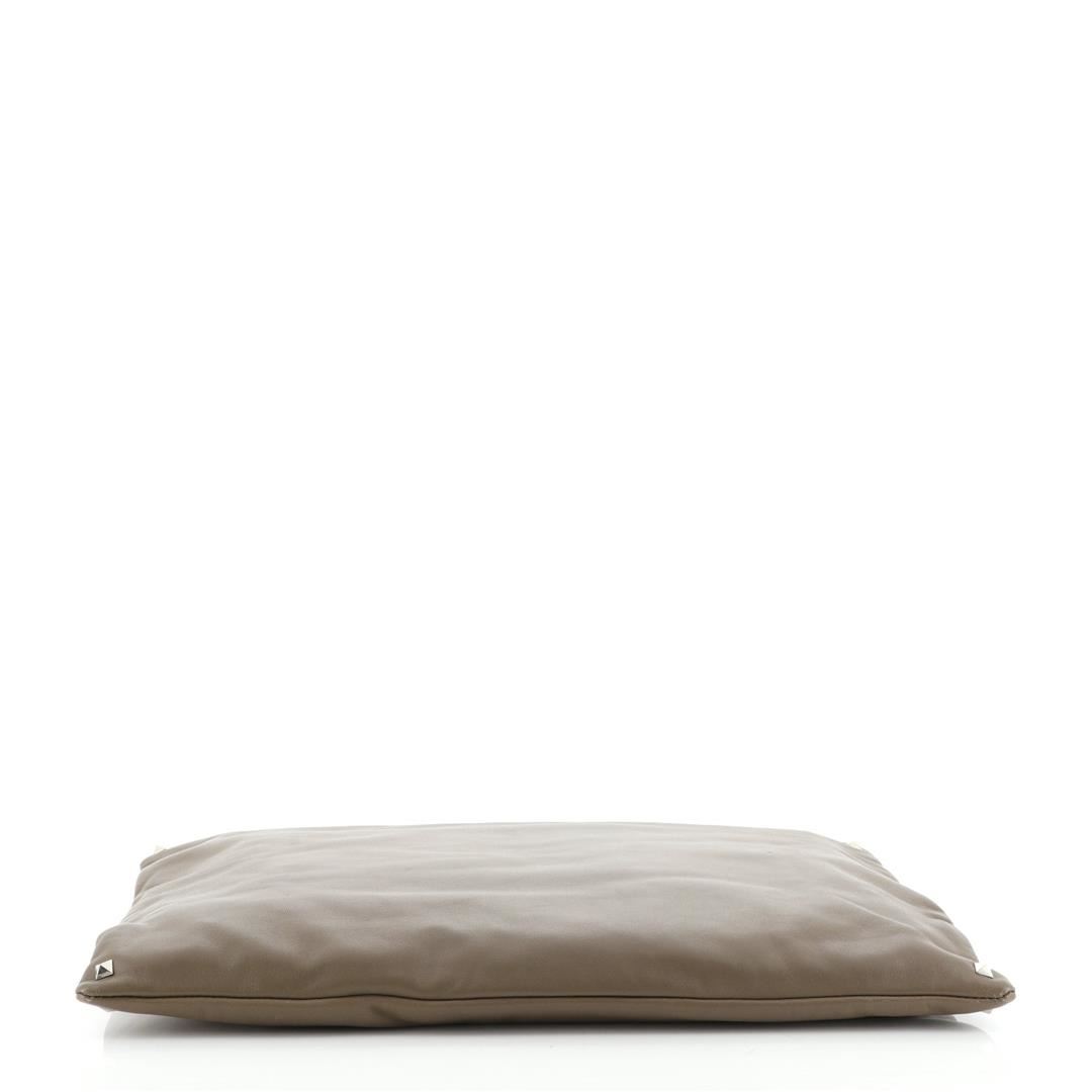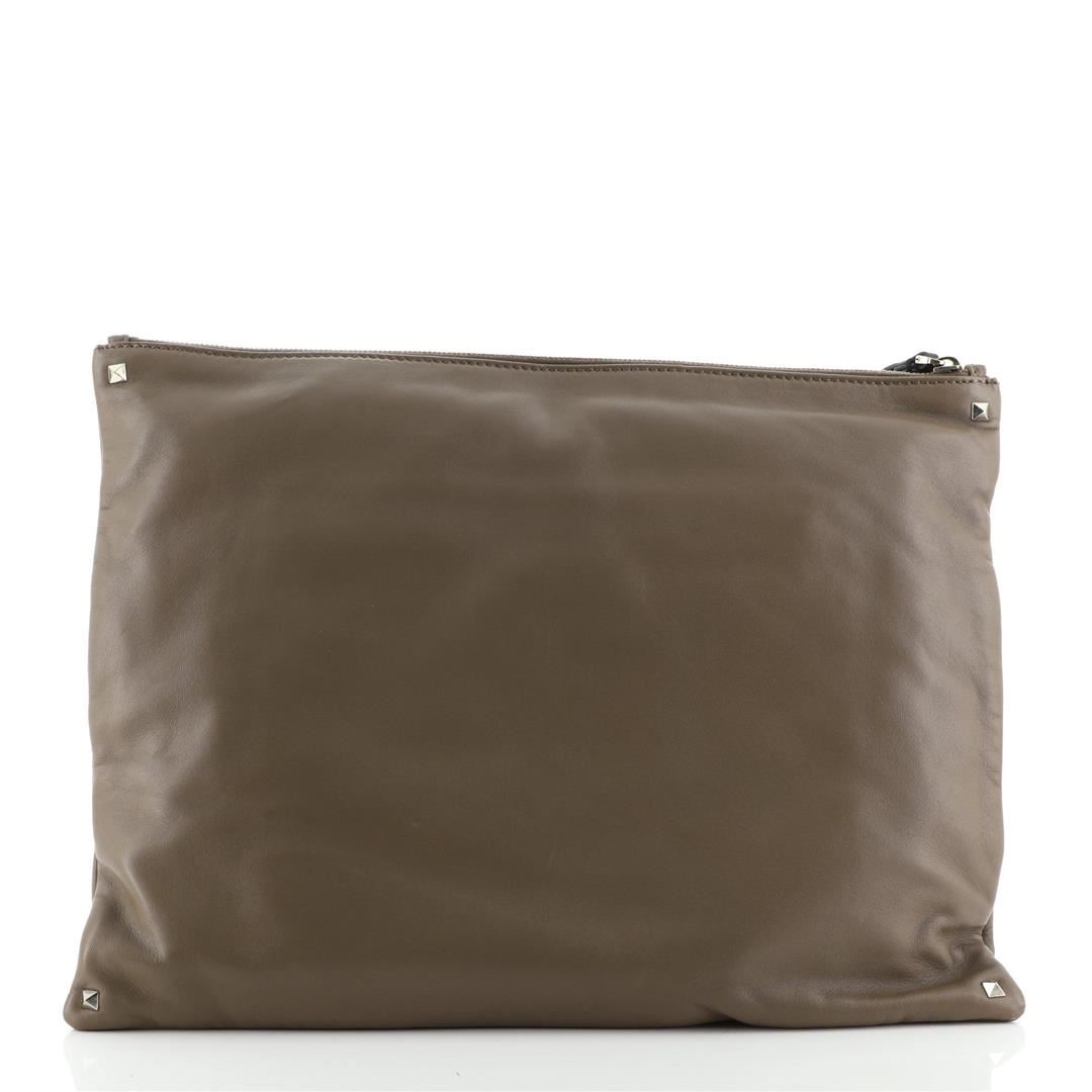 One Valentino Rockstud Wristlet Clutch Leather Oversized Brown. Item is sold AS-IS. All available information is listed in the description and shown in the photo. Valentino Rockstud Wristlet Clutch Leather Oversized Brown Condition Details: Creasing, scuffs and indentations on exterior, wear on opening corners. Minor wear in interior, discoloration on interior opening edges, scratches on hardware. Height 11.5", Width 15.5", Depth 1", Strap Drop None