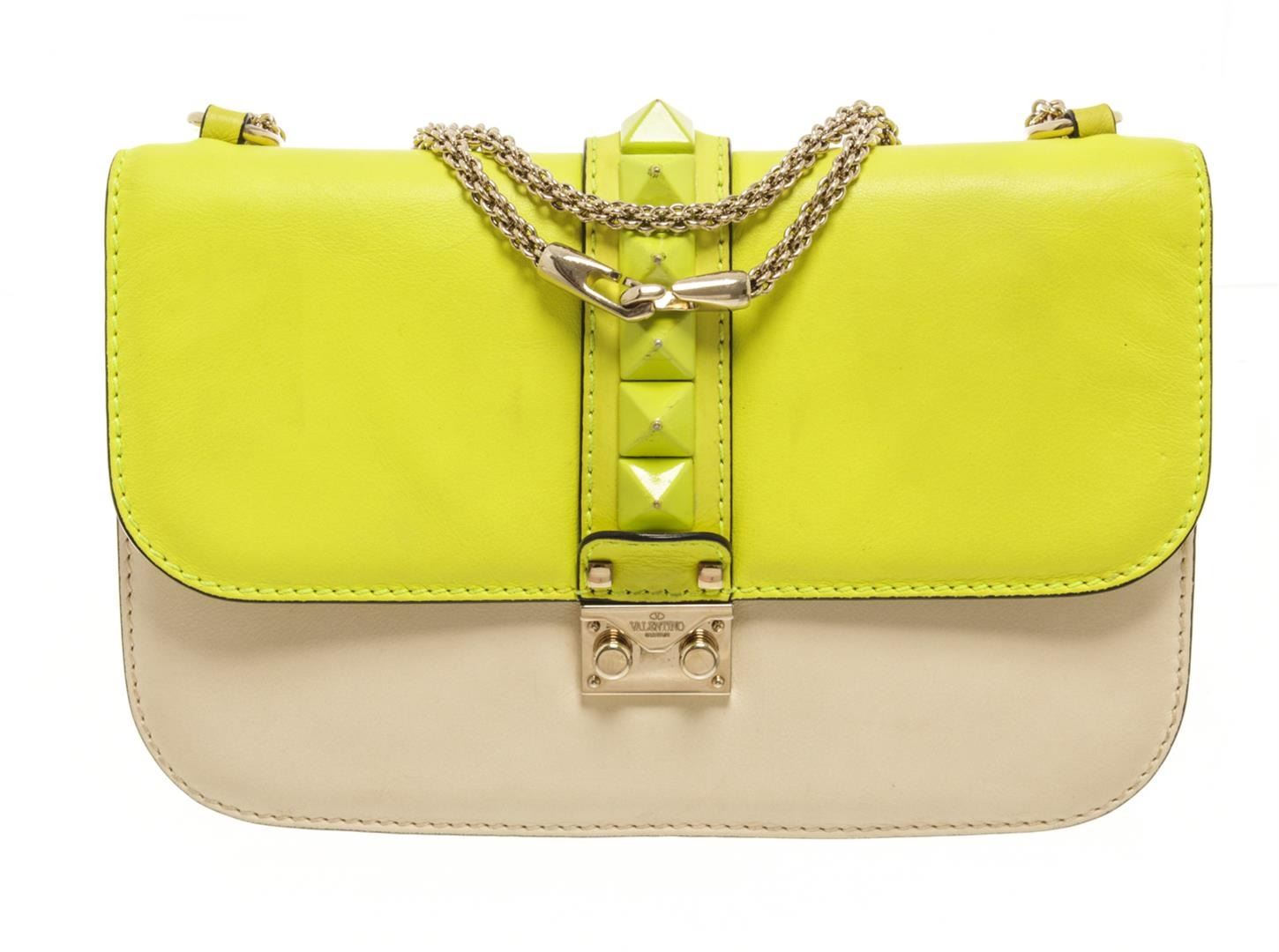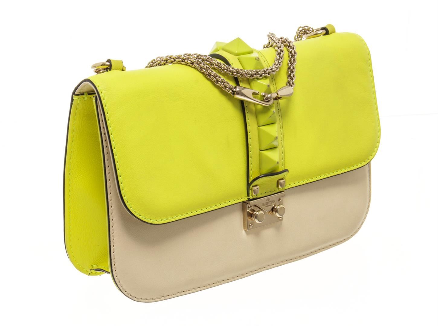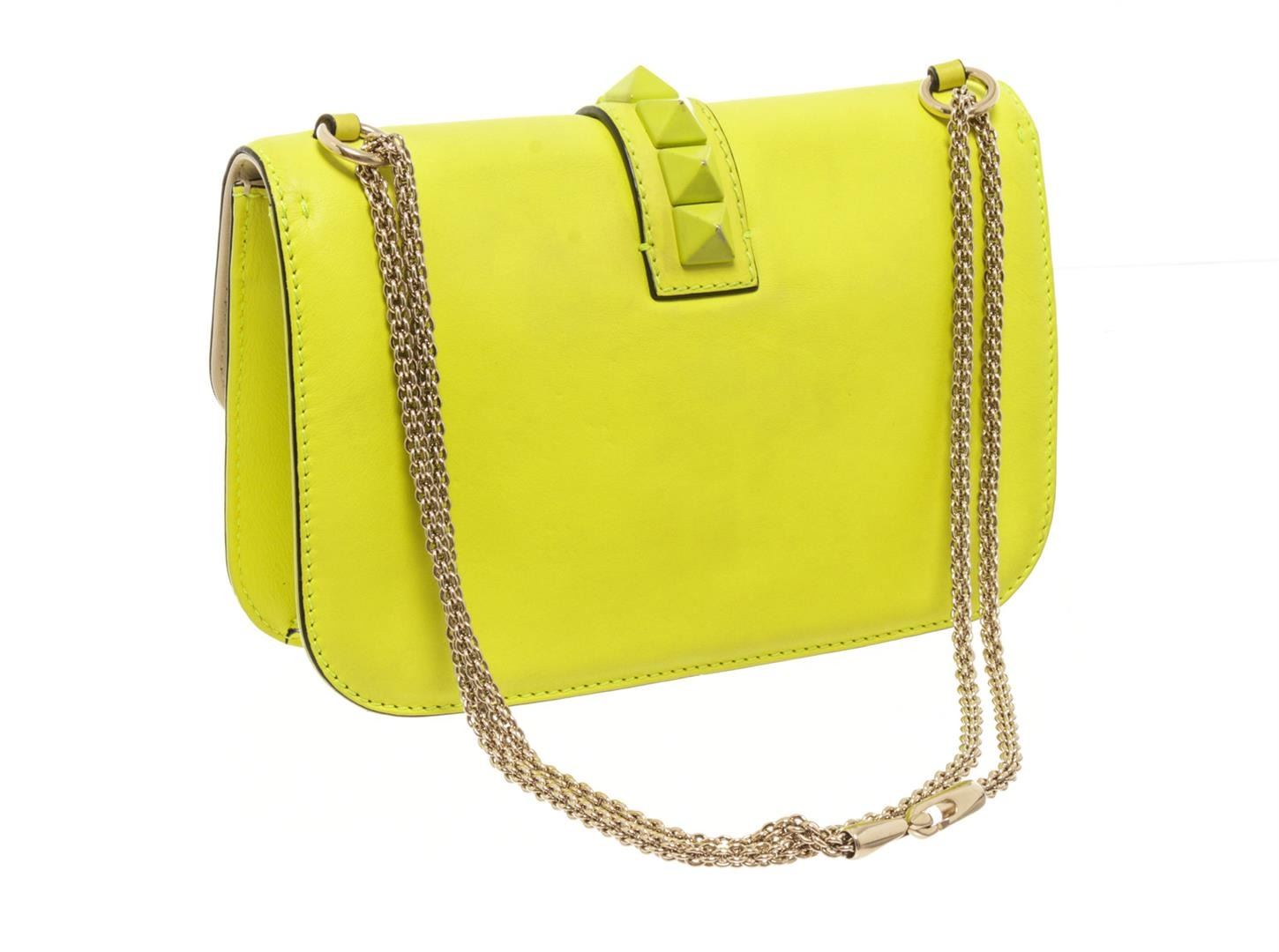 One Valentino Yellow Green Leather Glam Lock Shoulder Bag. Item is sold AS-IS. All available information is listed in the description and shown in the photo. Valentino Yellow Green Leather Glam Lock Shoulder Bag with silver tone hardware, chain shoulder strap, two interior pockets, canvas lining and snap closure.