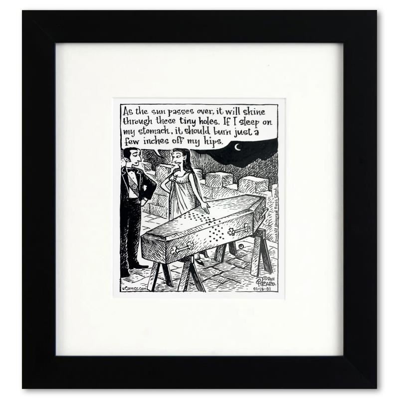 Enter a surreal and satirical world of twisted imagination and award winning creativity. "Vampire Hips" is an original pen & ink drawing on paper by Dan Piraro, creator of the critically acclaimed and award winning comic strip, Bizarro. This piece is hand signed, comes custom framed and includes a letter of authenticity. Measures approximately 12" x 11" (frame), 7" x 6" (image). This item requires special handling and may have a longer than usual turnaround.