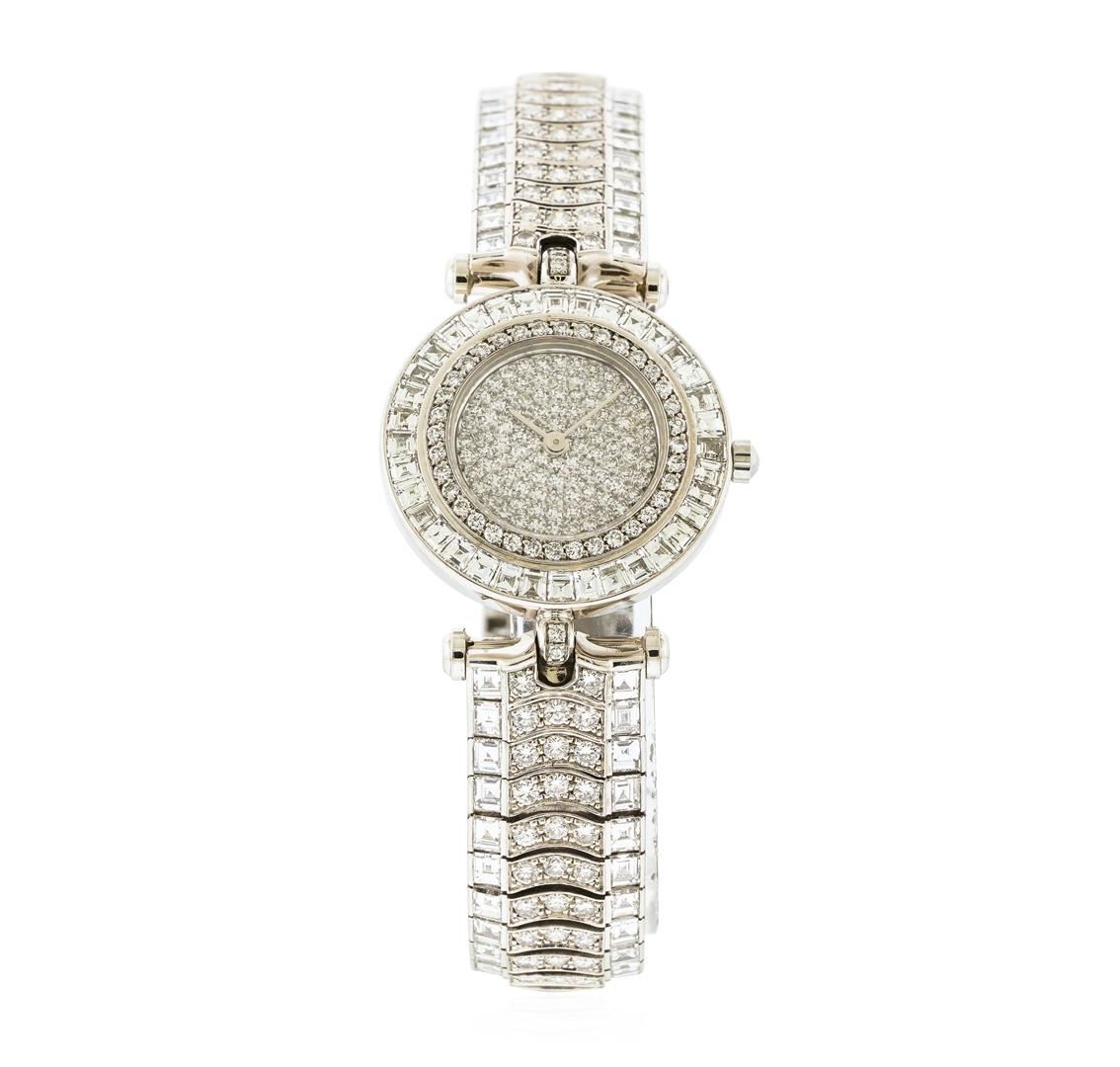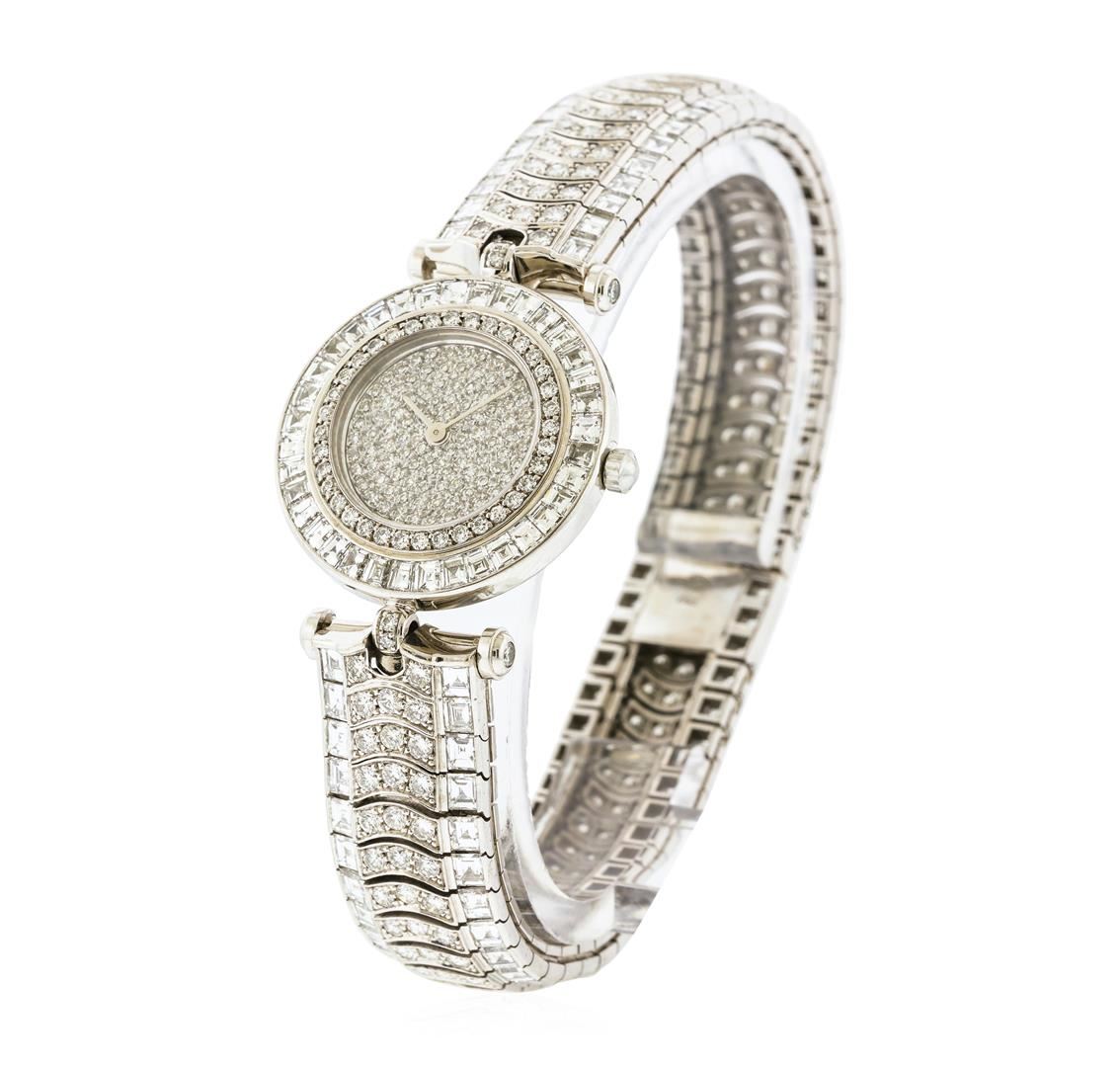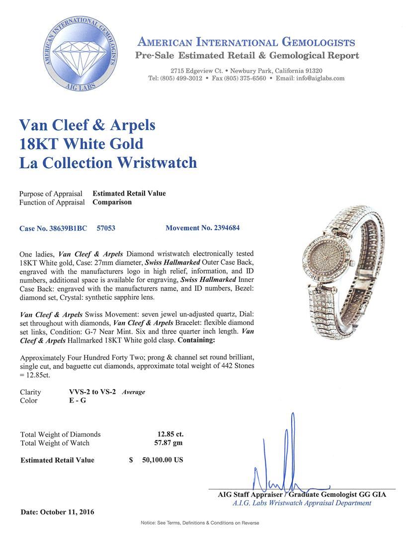 One ladies, Van Cleef & Arpels Diamond wristwatch electronically tested 18KT White gold, Case: 27mm diameter, Swiss Hallmarked Outer Case Back, engraved with the manufacturers logo in high relief, information, and ID numbers, additional space is available for engraving, Swiss Hallmarked Inner Case Back: engraved with the manufacturers name, and ID numbers, Bezel: diamond set, Crystal: synthetic sapphire lens. An Cleef & Arpels Swiss Movement: seven jewel un-adjusted quartz, Dial: set throughout with diamonds, Van Cleef & Arpels Bracelet: flexible diamond set links, Condition: G-7 Near Mint. Six and three quarter inch length. Van Cleef & Arpels Hallmarked 18KT White gold clasp. Containing: Approximately Four Hundred Forty Two; prong & channel set round brilliant, single cut, and baguette cut diamonds, approximate total weight of 442 Stones = 12.85ct. Clarity: VVS-2 to VS-2 Average Color E - G. Total Weight of Diamonds 12.85ct. Total Weight of Watch 57.87gm. AIG Appraised at $50,100.00.