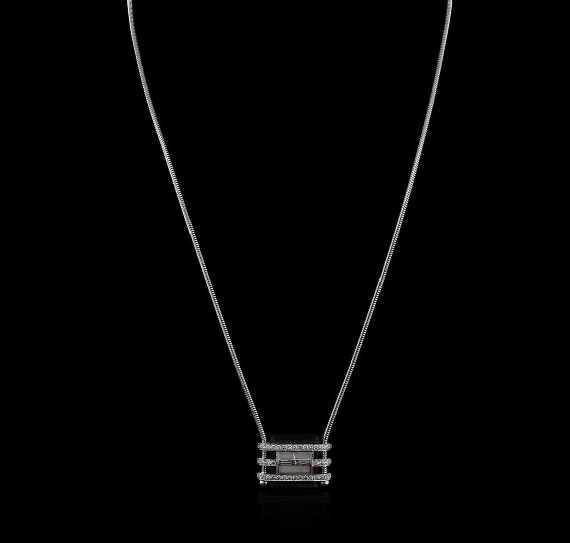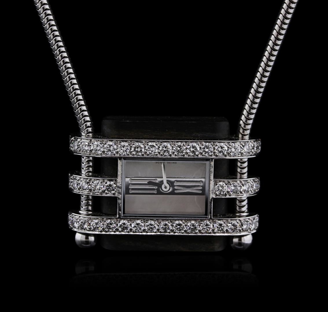 One Van Cleef & Arpels watch chain necklace: 18KT white gold weighing 51.00 grams containing diamonds. 7/8" x 7/8" black wood case, mother of pearl dial, with 24" 18K white gold rope chain. Signed and numbered on the back.