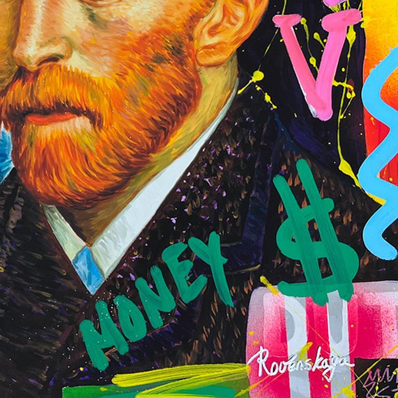 "Van Gogh" is a one-of-a-kind mixed media on deckle edge paper by Nastya Rovenskaya; hand signed by the artist. This piece comes custom framed and includes letter of authenticity. Measures approximately 30" x 36" (framed), 24" x 30" (image).