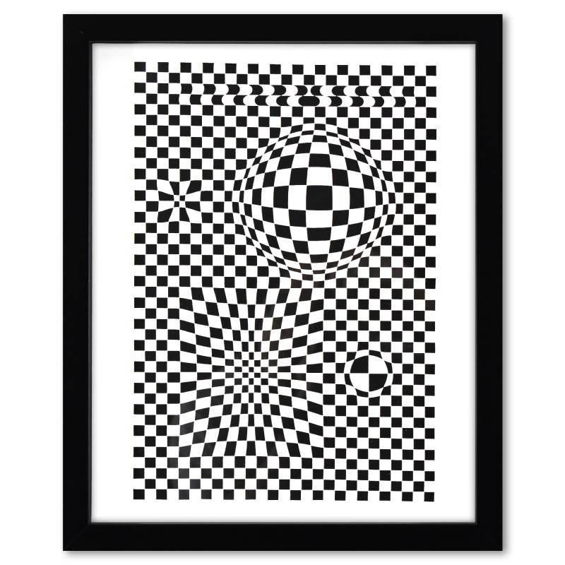 "Vega de la serie Corpusculaires" is a heliogravure print on paper, published in 1973, by Victor Vasarely (1908-1997). This piece comes custom framed, with a letter of authenticity and with a 1976 Vasarely paperback. Measures approx. 12.5" x 15" (frame), 10" x 13" (image).