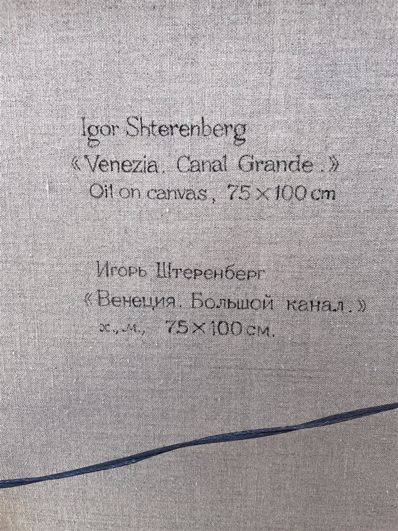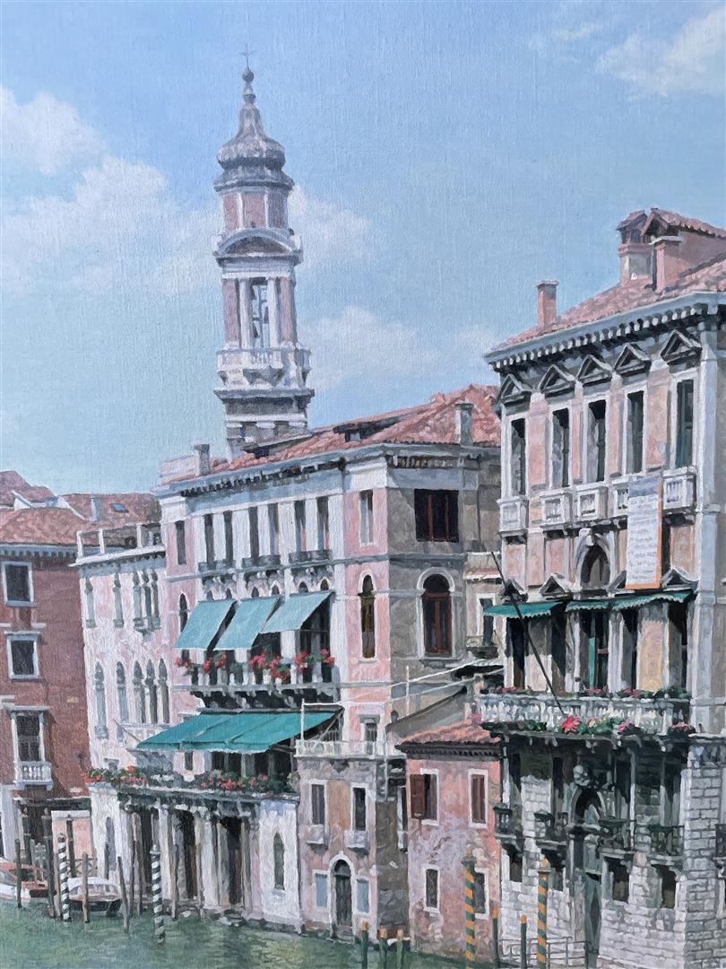 Colorful flowers and awnings overlook the classic Venice Canal beneath a beautiful blue sky in Igor Shterenberg's oil on canvas. The painting measures 39.25 x 29.5; framed image measures approx. 51.25 x 41.5.