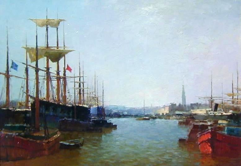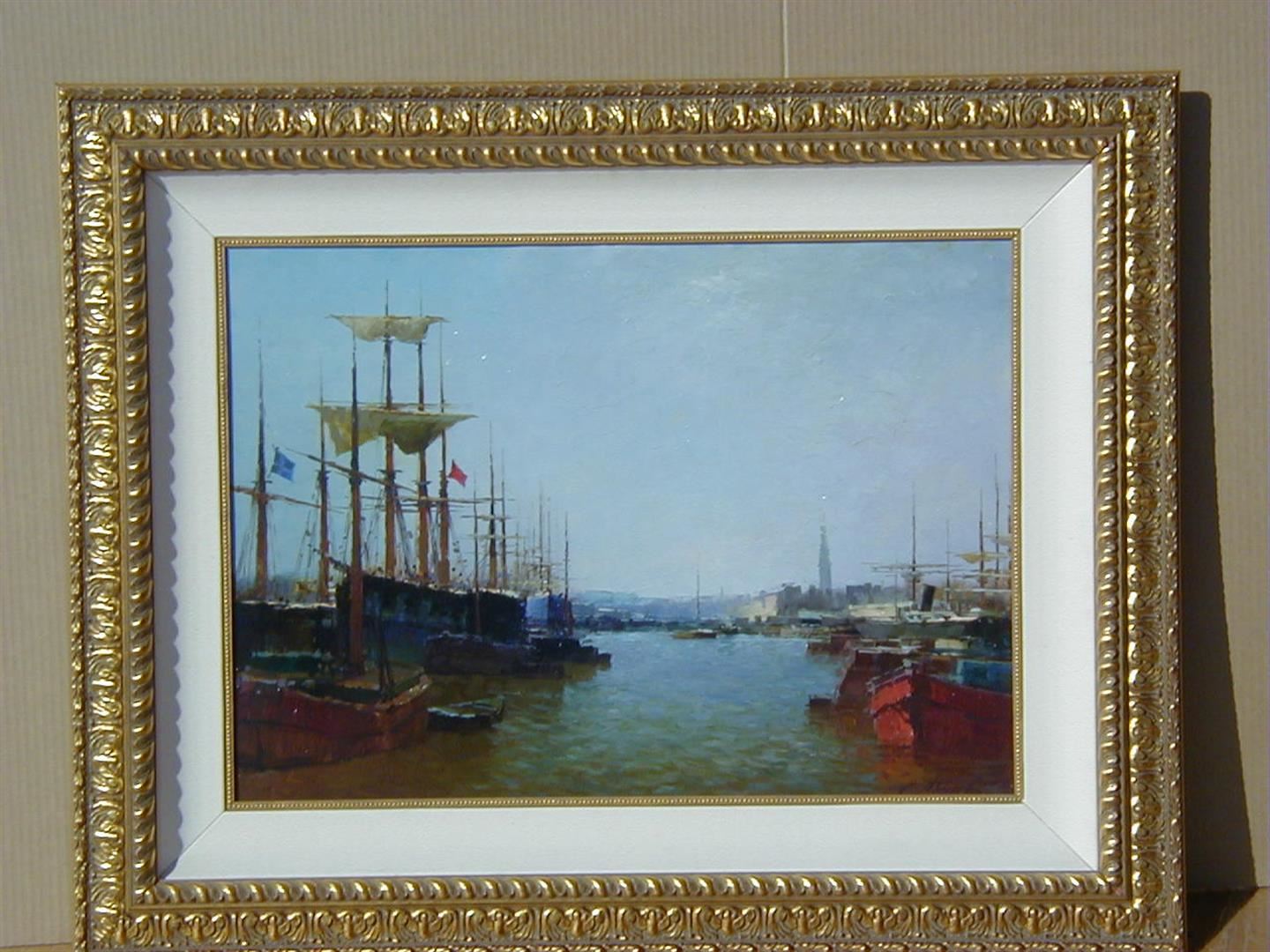 The classically-trained Russian artist, Alexander Popoff, with influences of Impressionism and Flemish painting, creates a sense of nostalgia in this oil painting of a busy sea harbor. The painting measures 19.625 x 27.5; framed image measures approx. 31.625 x 39.5.