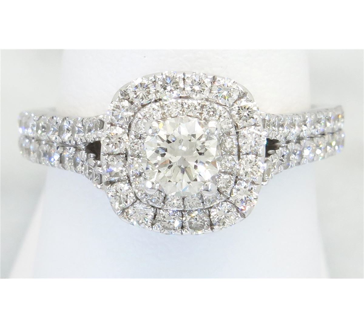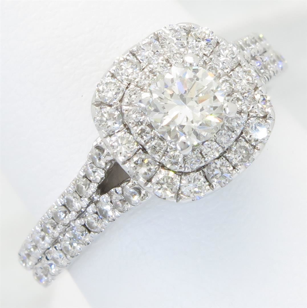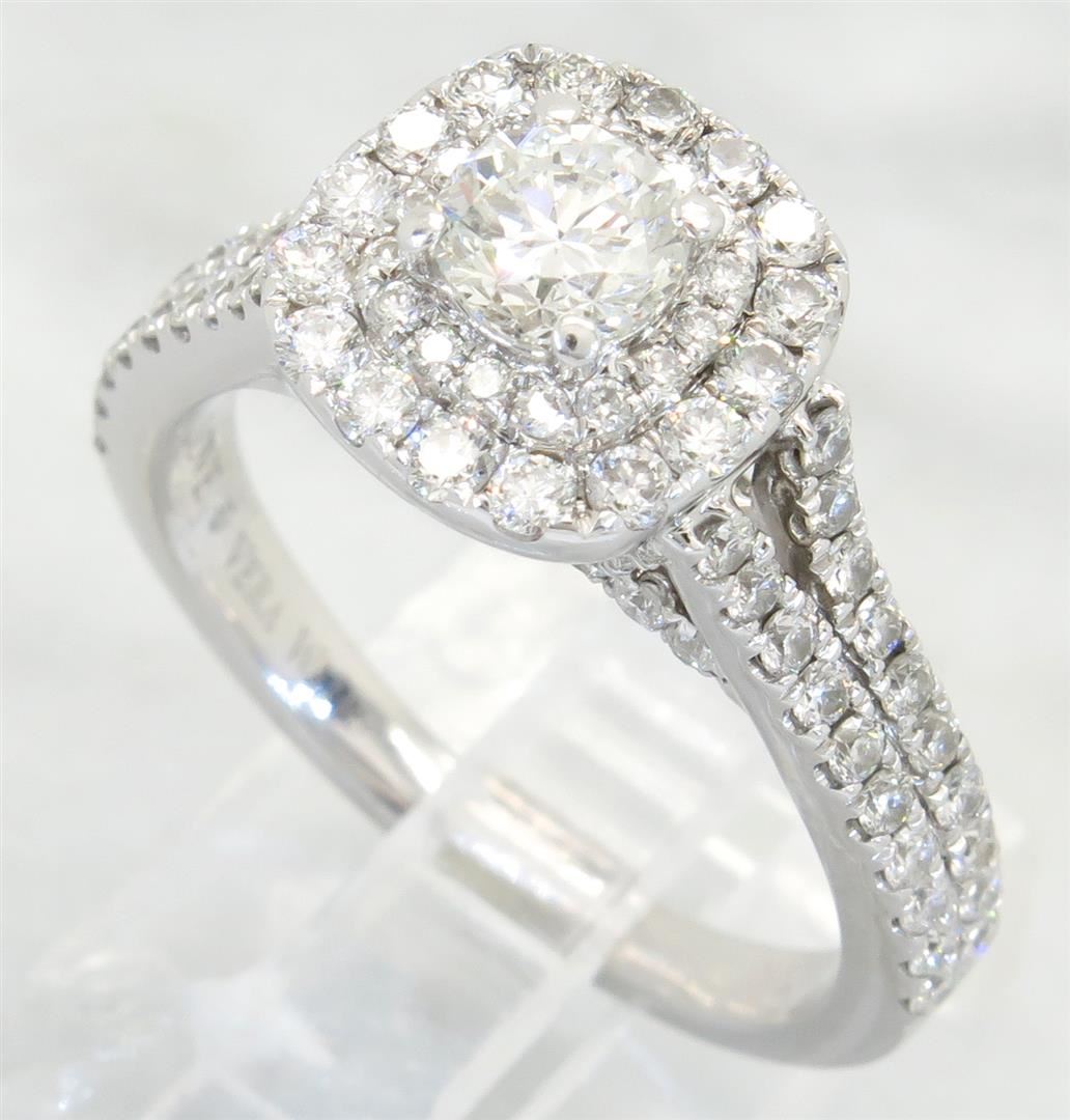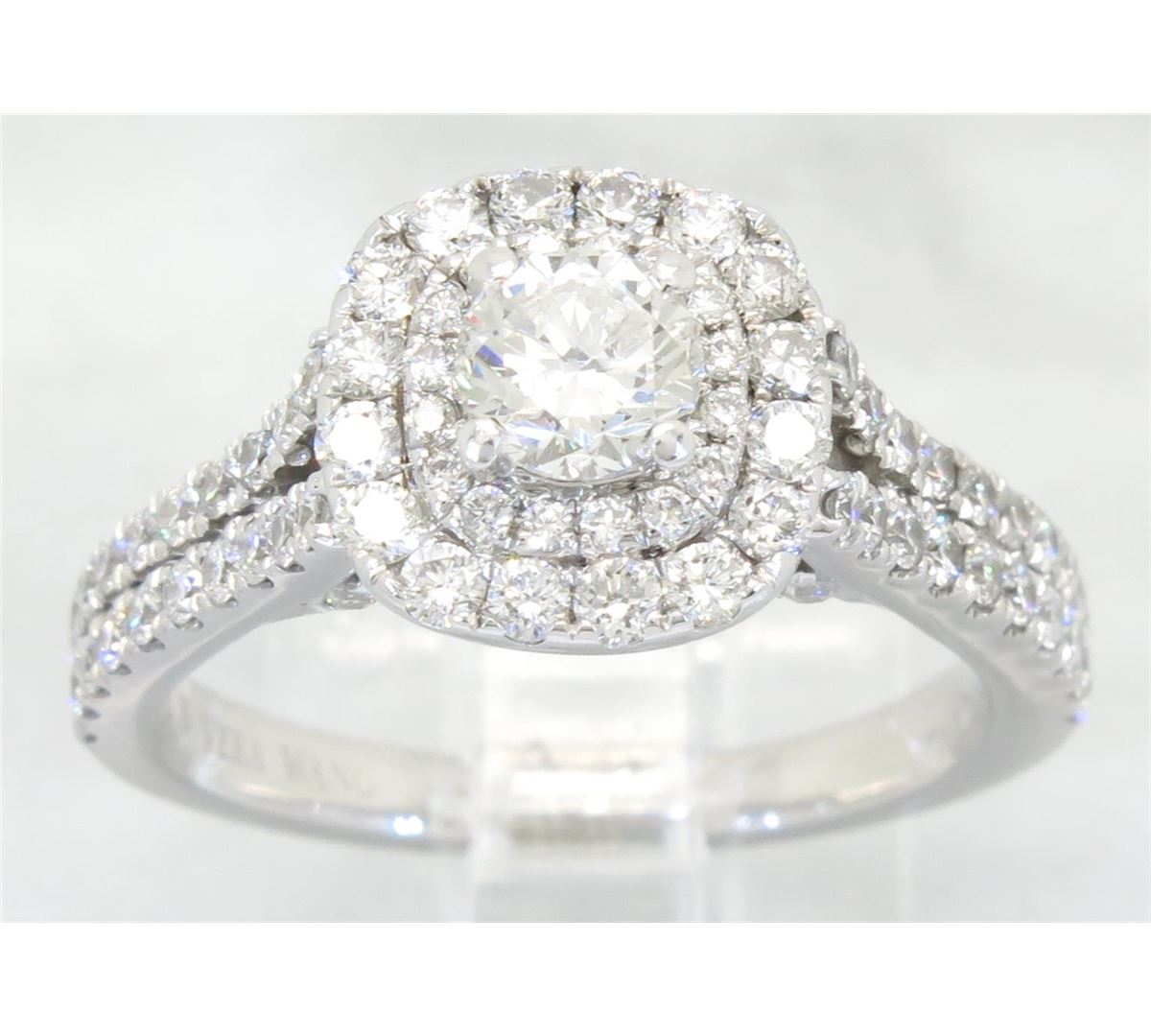 One tested 14K white gold designer Vera Wang diamond ring. Containing: One Round Brilliant Cut Diamond. Approximate Size: .43CT, Clarity: I, Color: H-I. 92 Round Brilliant Cut Diamonds, two blue sapphires. Approximate total diamond weight: 1.30CTW. Approximate sapphire weight: .05CTW. All diamonds are graded in the mounting unless otherwise stated. Weight of ring: 5.7 grams, Size: 6.25.