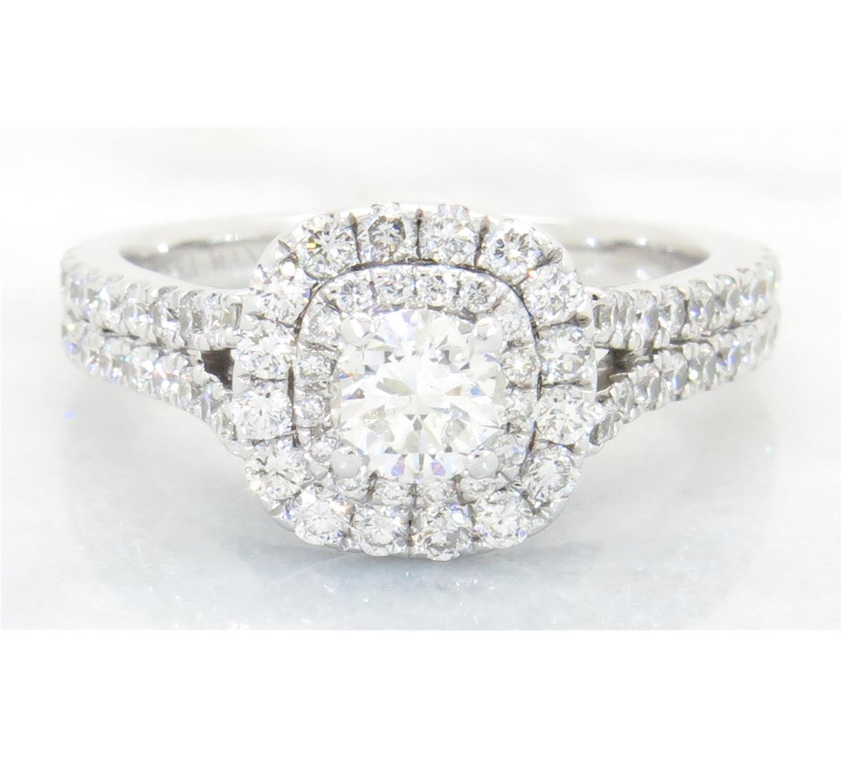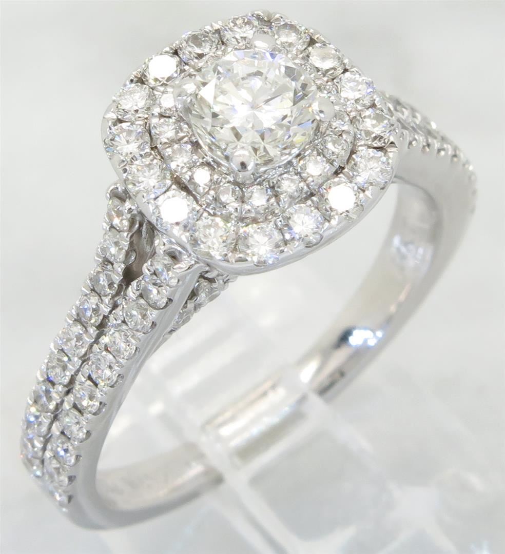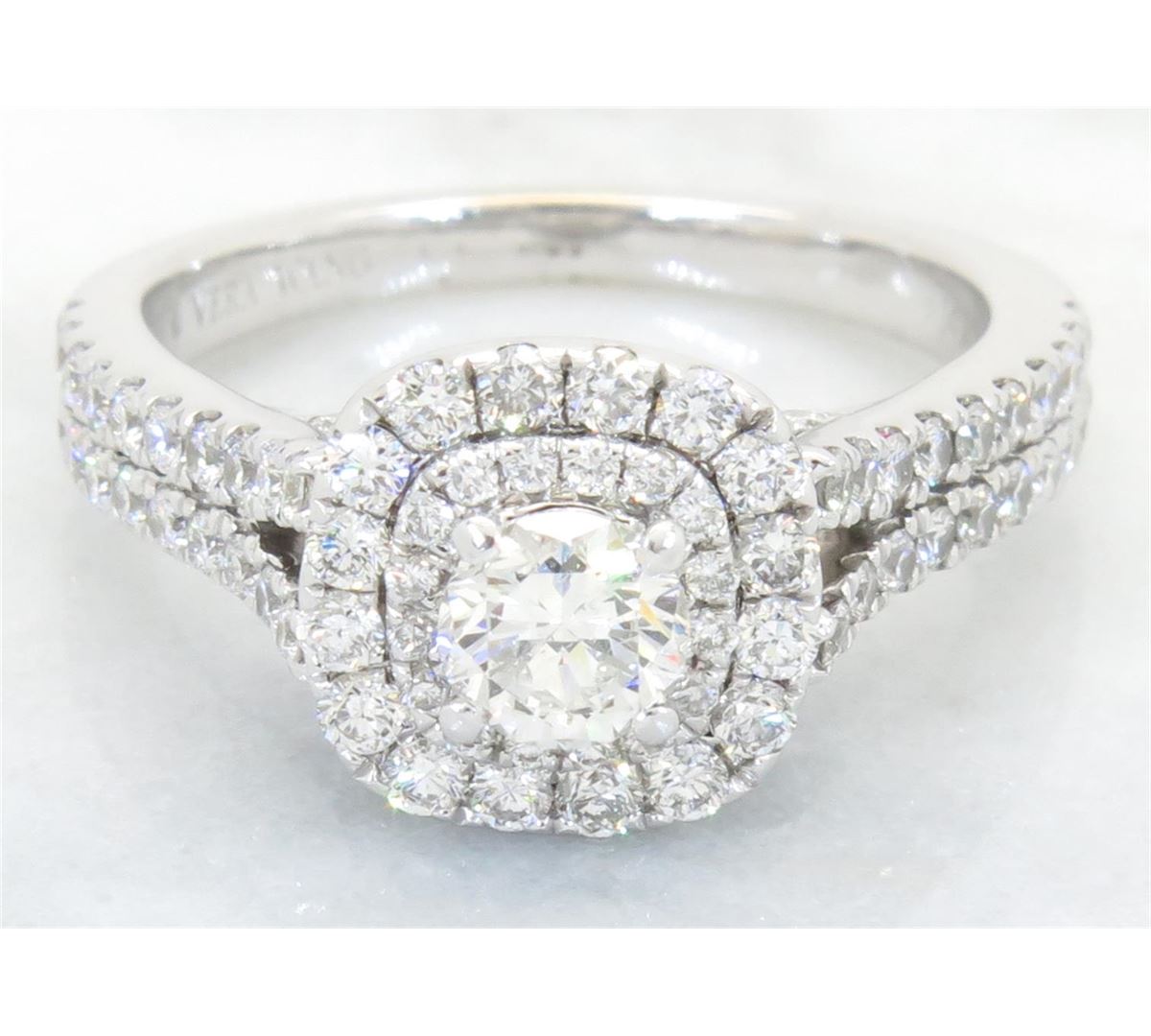 One tested 14K white gold designer Vera Wang diamond ring. Containing: One Round Brilliant Cut Diamond. Approximate Size: .43CT, Clarity: I, Color: H-I. 92 Round Brilliant Cut Diamonds, two blue sapphires. Approximate total diamond weight: 1.30CTW. Approximate sapphire weight: .05CTW. All diamonds are graded in the mounting unless otherwise stated. Weight of ring: 5.7 grams, Size: 6.25.