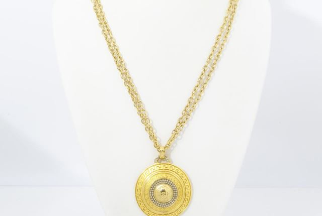 One Versace Gold-tone Round Medusa Pendant Necklace. Item is sold AS-IS. All available information is listed in the description and shown in the photo. Versace Medusa necklace features gold-tone hardware, round medallion pendant with Medusa logo at front surrounded by lab-created crystals and lobster claw closure.