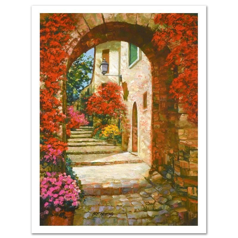 With bright colors and lush textures, Howard Behrens' artwork adds a tropical and exotic feel to any art collection. "Via St. Tropez" is a limited edition hand embellished giclee on canvas. Numbered and hand signed by the artist. Includes Certificate of Authenticity! Measures approx. 20" x 27"(image).