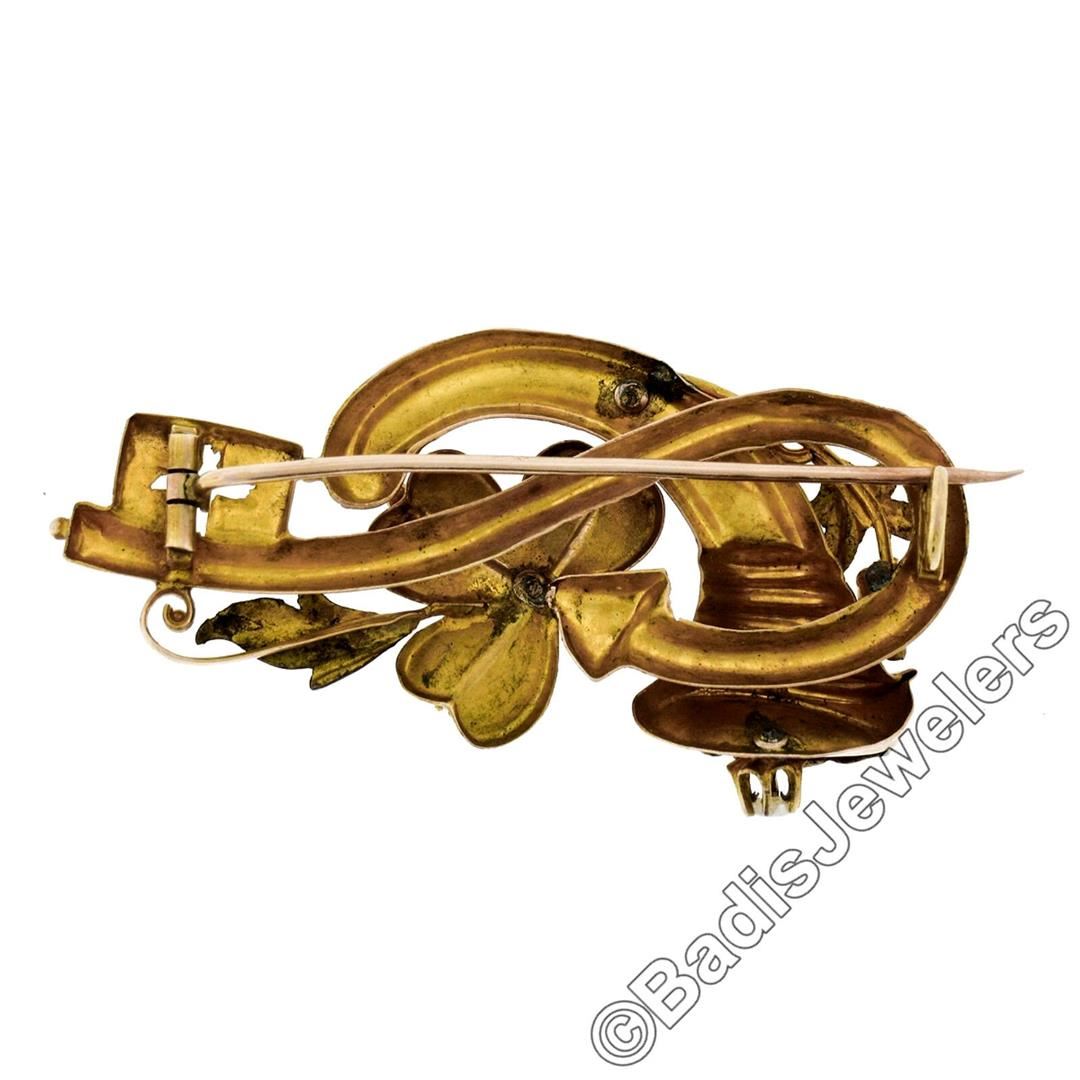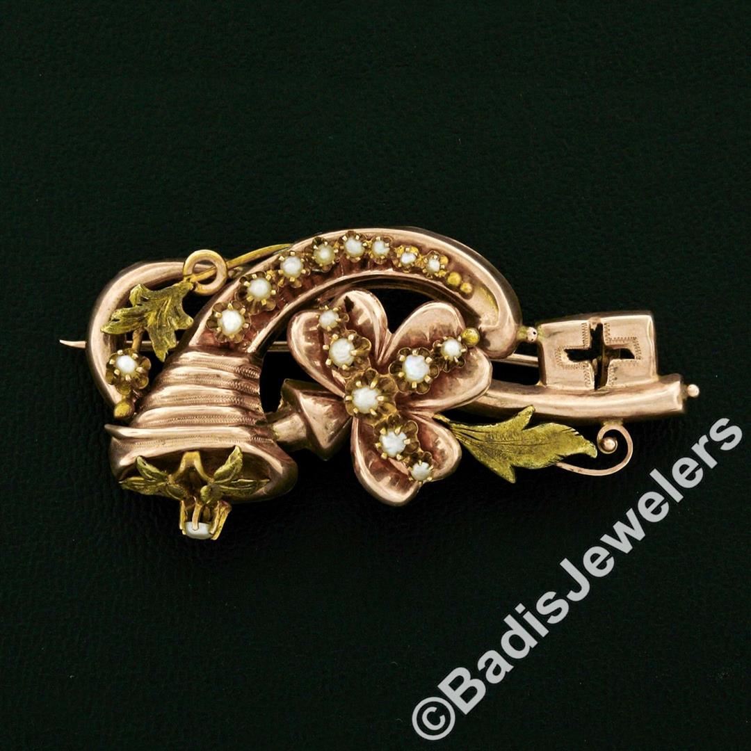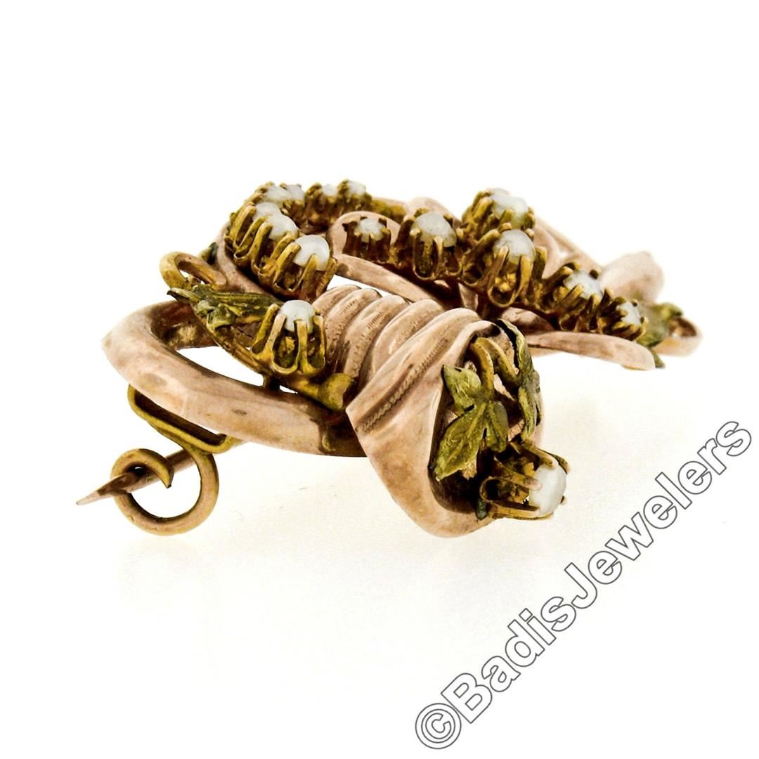 A Victorian era 12kt rose and green gold flower and leaf bouquet brooch featuring 17 natural seed pearls (1.2mm to 2.5mm). Measures 54.00x25.55mm and weighs a total of 7.88 grams.