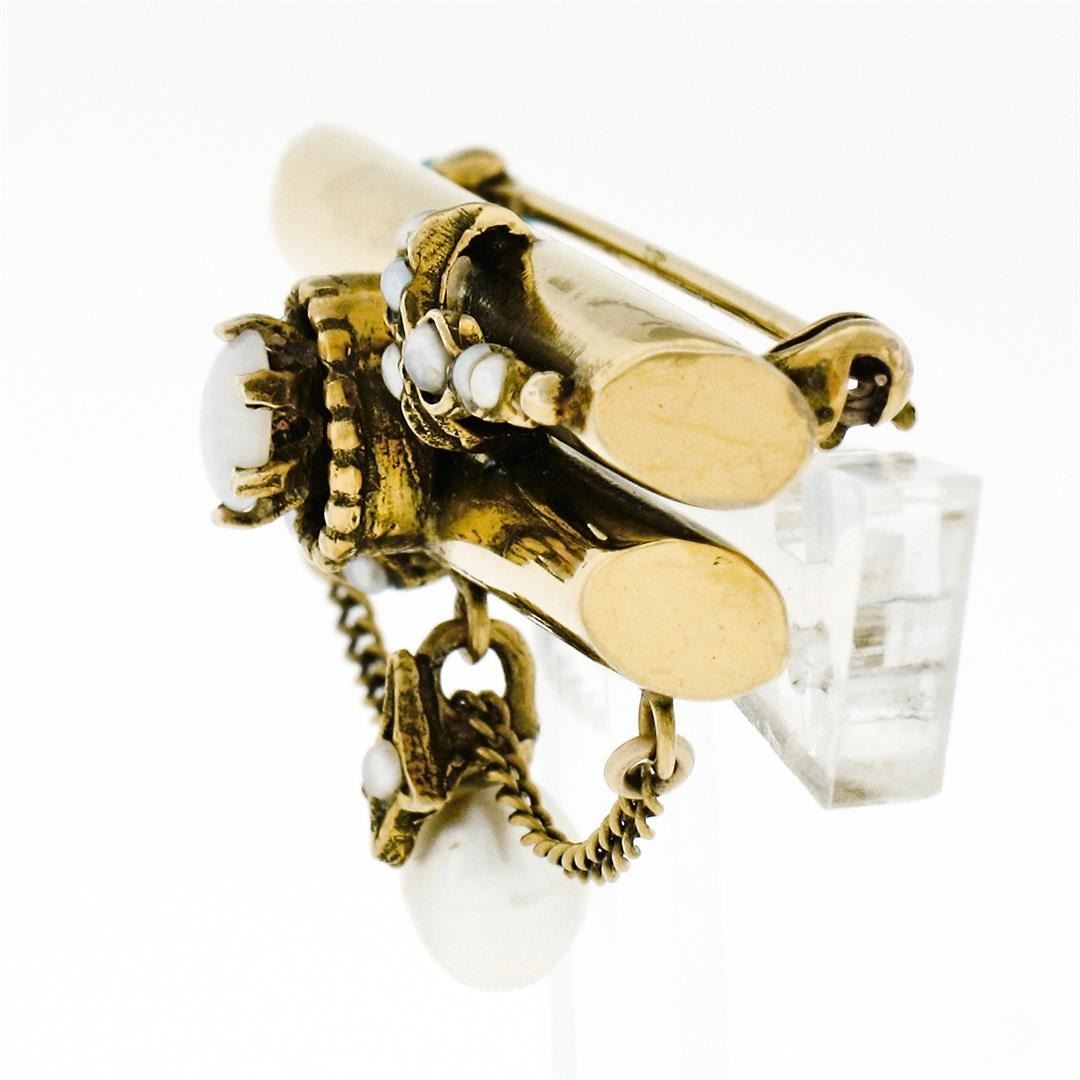 A Victorian era 14k yellow gold dual bar pin featuring an oval cabochon opal (4.90x4.15mm), 15 round natural seed pearls (1.75 to 1.95mm), and an egg shaped natural pearl dangle (5.00x6.16mm). Measures 48.5x23.0mm and weighs a total of 7.66 grams.