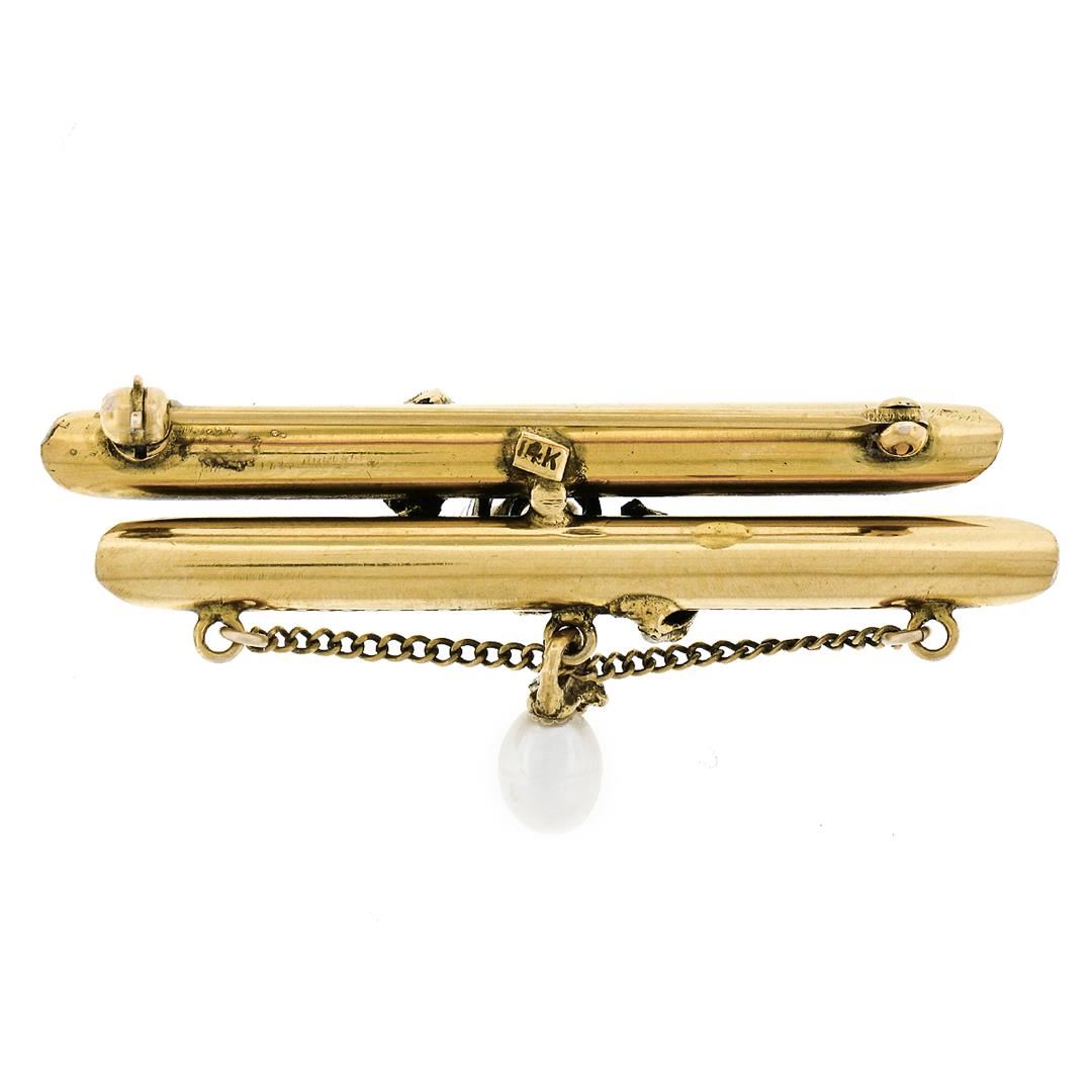 A Victorian era 14k yellow gold dual bar pin featuring an oval cabochon opal (4.90x4.15mm), 15 round natural seed pearls (1.75 to 1.95mm), and an egg shaped natural pearl dangle (5.00x6.16mm). Measures 48.5x23.0mm and weighs a total of 7.66 grams.
