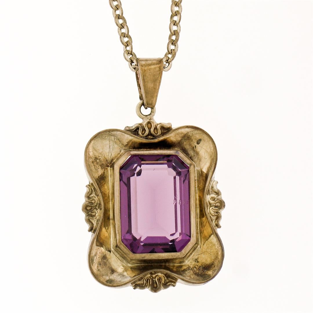 A Victorian era 8k yellow gold pendant necklace featuring a bezel set octagonal cut amethyst (14.0x10.0mm; 7.25ct). 24 inch cable link chain, 6.63 grams total weight, pendant measures 32.25x19.40mm.