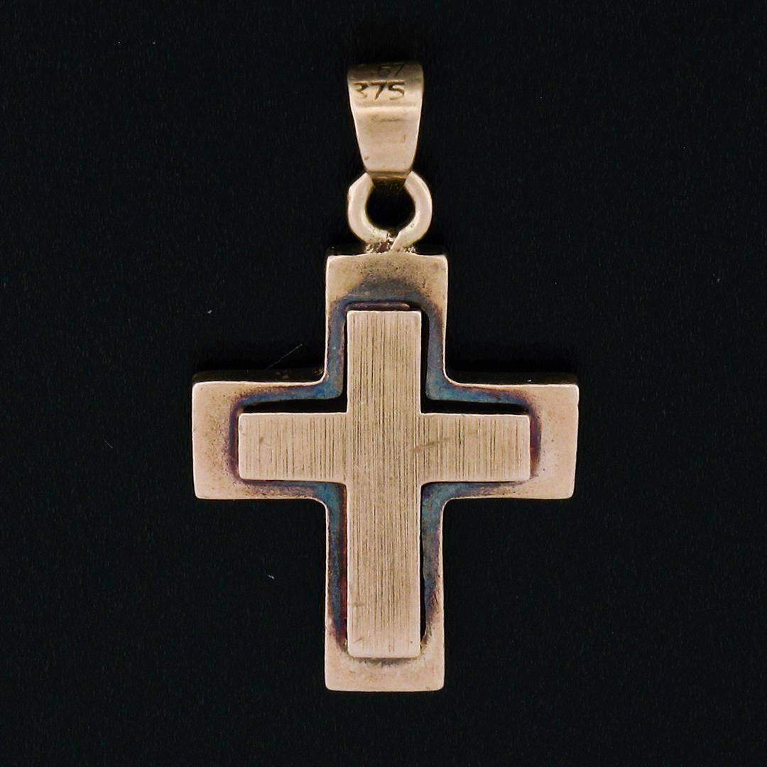 A Victorian era 8k rose gold reversible cross pendant featuring a brushed inner section surrounded by a polished frame. The pendant weighs a total of 2.01 grams, measures 26.6x15.0mm including the bail, and the inside of the bail measures 4.0x3.5mm.
