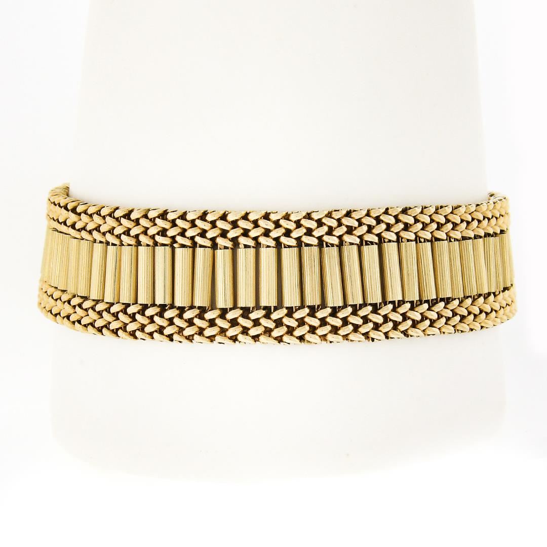A victorian revival 14k yellow gold & enamel work buckle strap bracelet. It weighs a total of 51.46 grams, measures 28.65mm wide, and measures 8 inches in length.