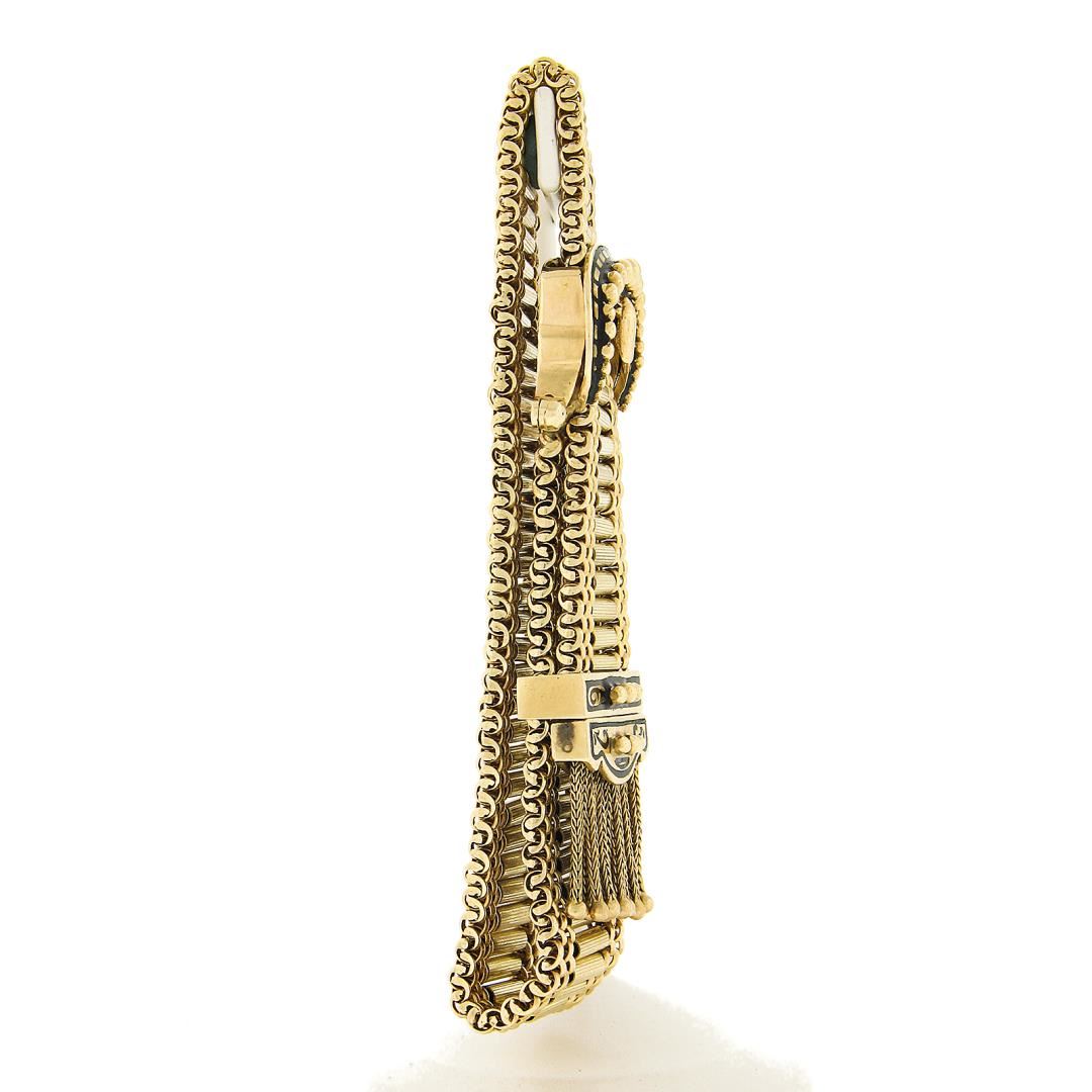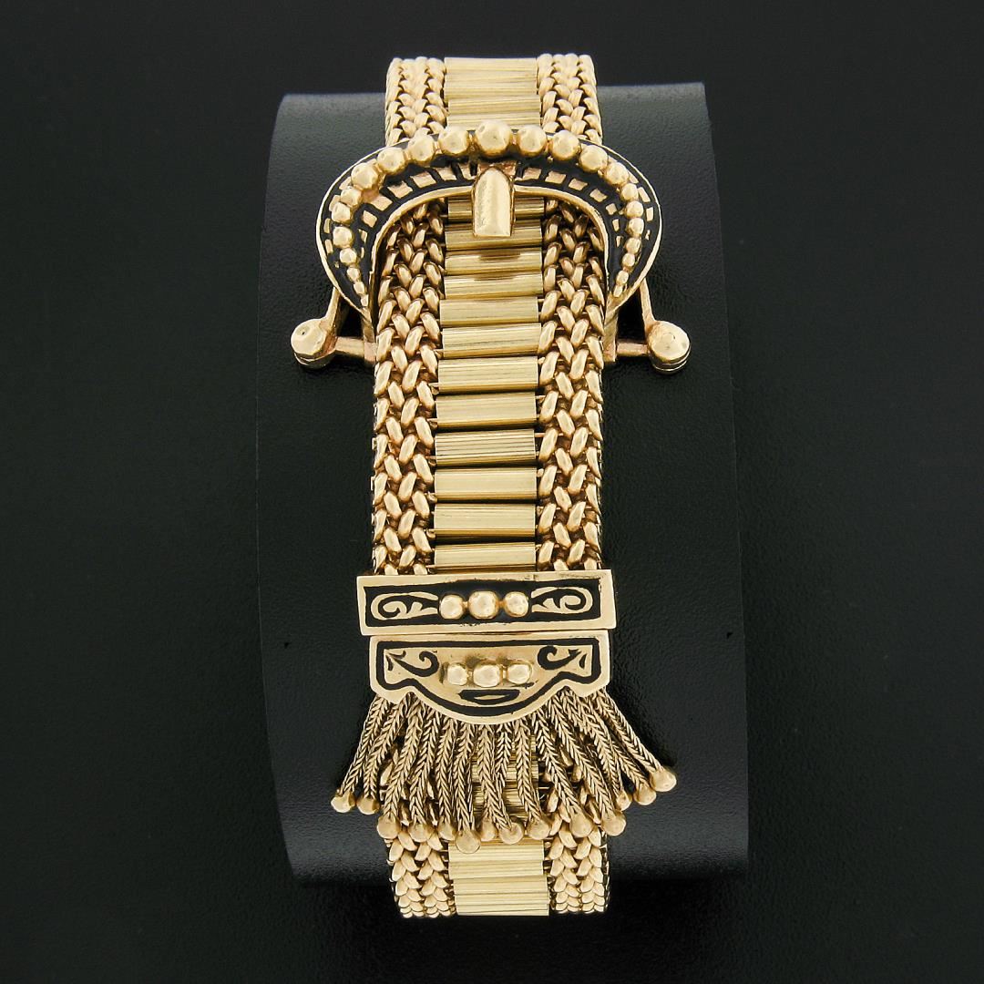 A victorian revival 14k yellow gold & enamel work buckle strap bracelet. It weighs a total of 51.46 grams, measures 28.65mm wide, and measures 8 inches in length.