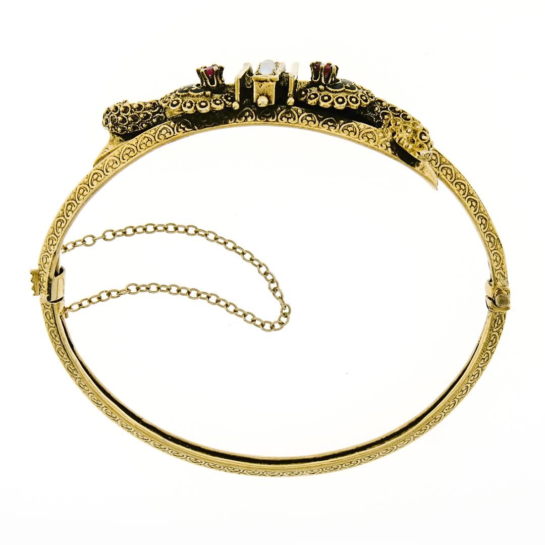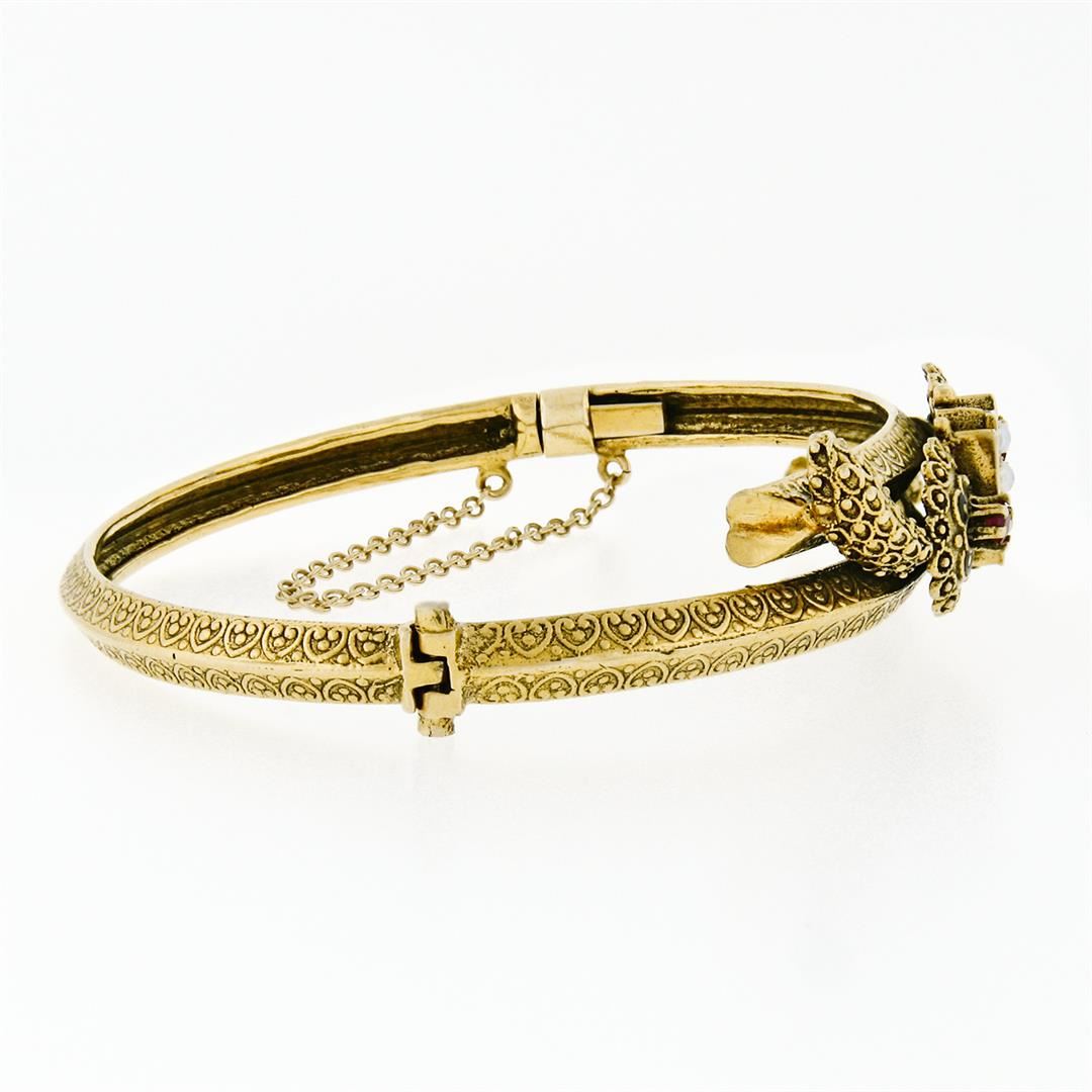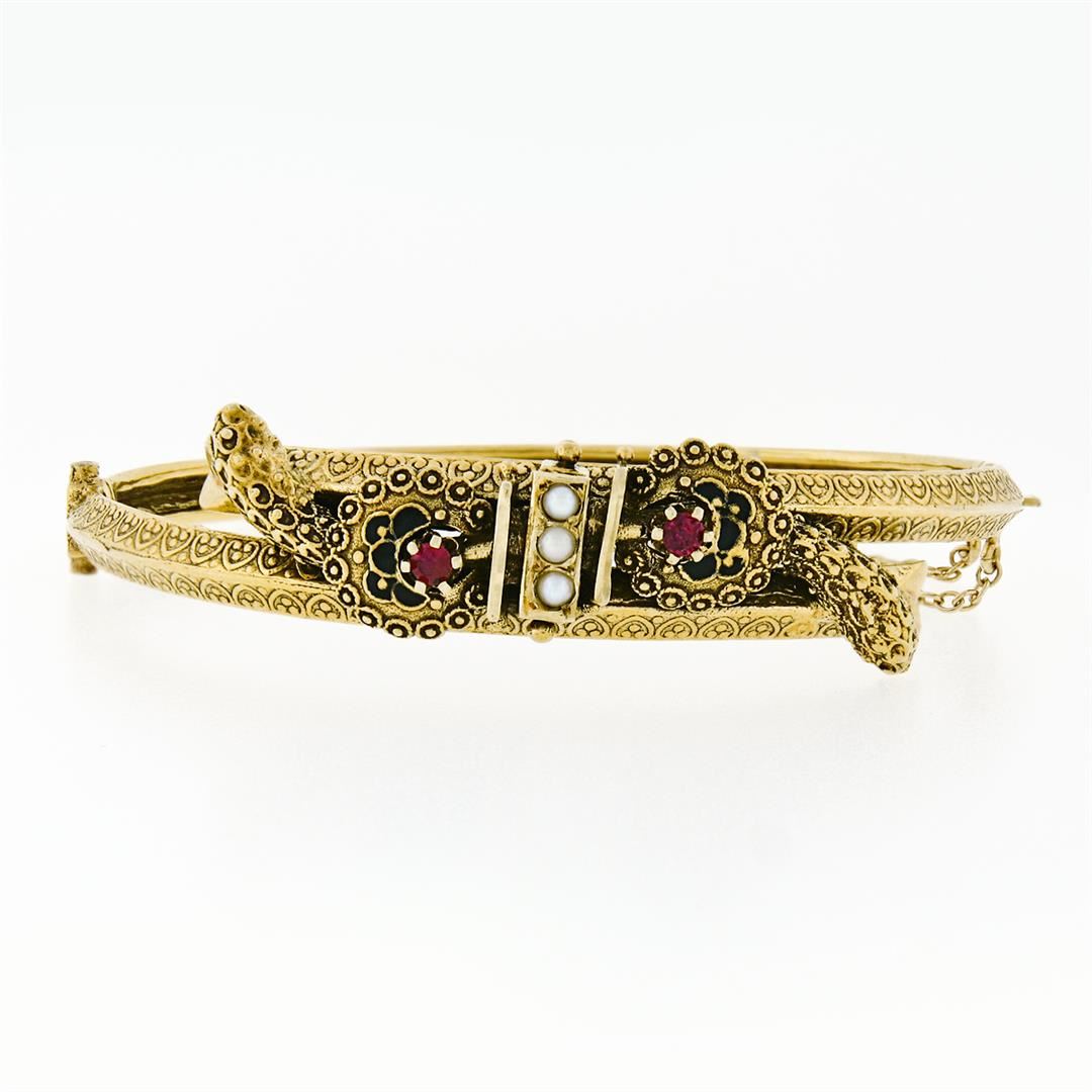An antique solid 14k yellow gold snake bypass hinged bangle bracelet, with 2 round cut natural rubies (0.20ctw), and 3 round shape natural cultured pearls (2.25mm). It weighs a total of 18.26 grams, measures 14.91mm wide, and measures 6.25 inches in length.