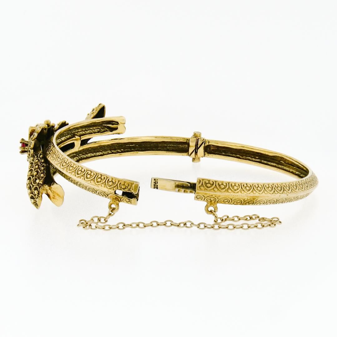 A victorian revival 14k yellow gold hinged bangle bracelet, with 2 round cut natural rubies (0.20ctw), and 3 round cultured pearls (2.25mm). It weighs a total of 18.26 grams, measures 14.91mm wide, and measures 6.25 inches in length.
