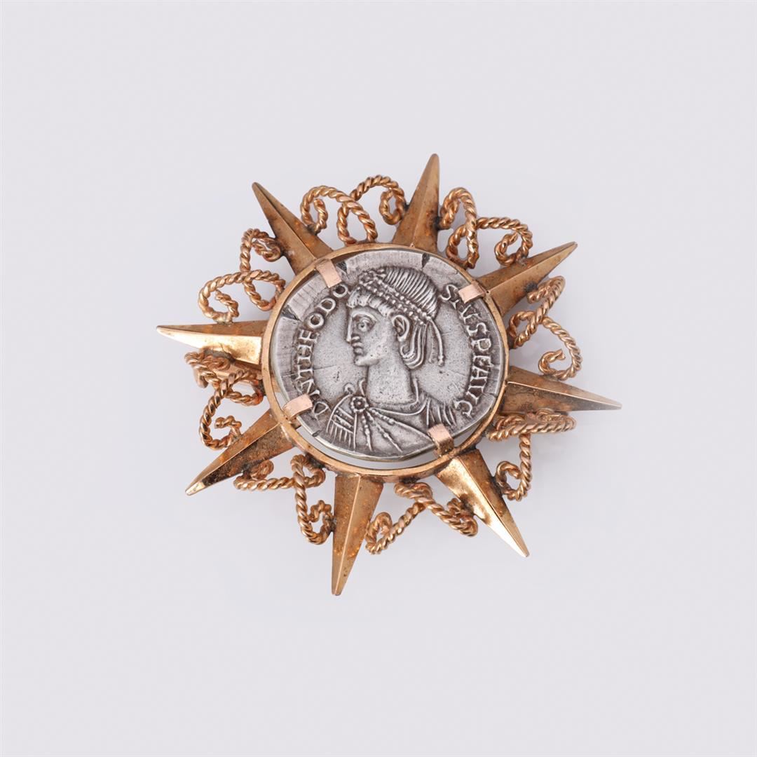 Victorian 14K Rose Gold Pendant/Brooch Mounted With Silver Byzantine Coin. Total weight is 10.7 gm. Estimated retail value $1,000.