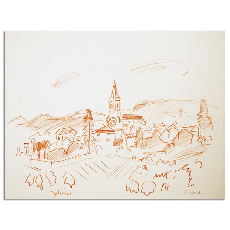 "View Of Julienas In Beaujolais, France" is an original Mixed Media on Paper by Wayne Ensrud. The piece is hand signed by the artist and comes with a Certificate of Authenticity. Measures approximately 12.75" x 15.5".