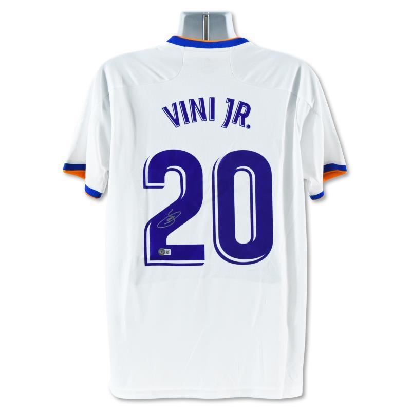 Vini Jr Real Madrid Jersey by Junior, Vini. This is a replica Real Madrid soccer jersey autographed by Vini Jr. This piece is presented with a Certificate of Authenticity from Beckett with a QR code and certification number. Measures approx. 30" x 28" (jersey).
