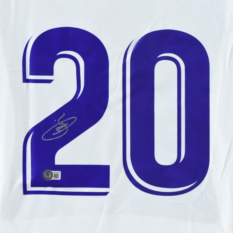 Vini Jr Real Madrid Jersey by Junior, Vini. This is a replica Real Madrid soccer jersey autographed by Vini Jr. This piece is presented with a Certificate of Authenticity from Beckett with a QR code and certification number. Measures approx. 30" x 28" (jersey).
