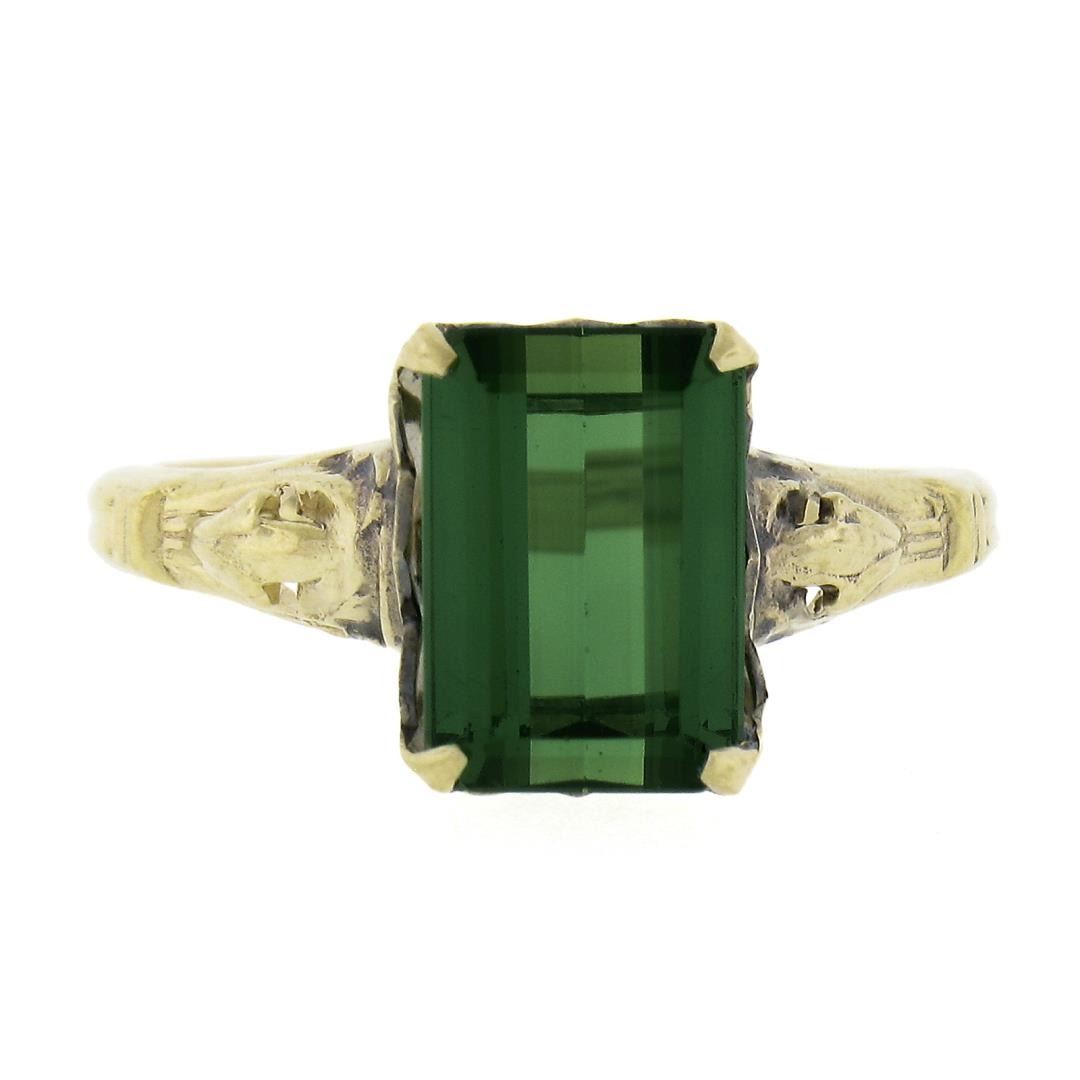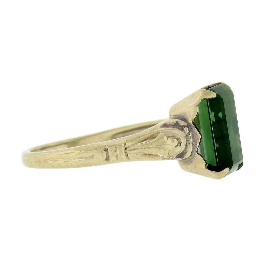 A vintage solid 10k yellow gold ring, with 1 emerald cut natural tourmaline (2.64ct). The ring is size 6.5, weighs a total of 2.14 grams, and measures 9.8mm wide.