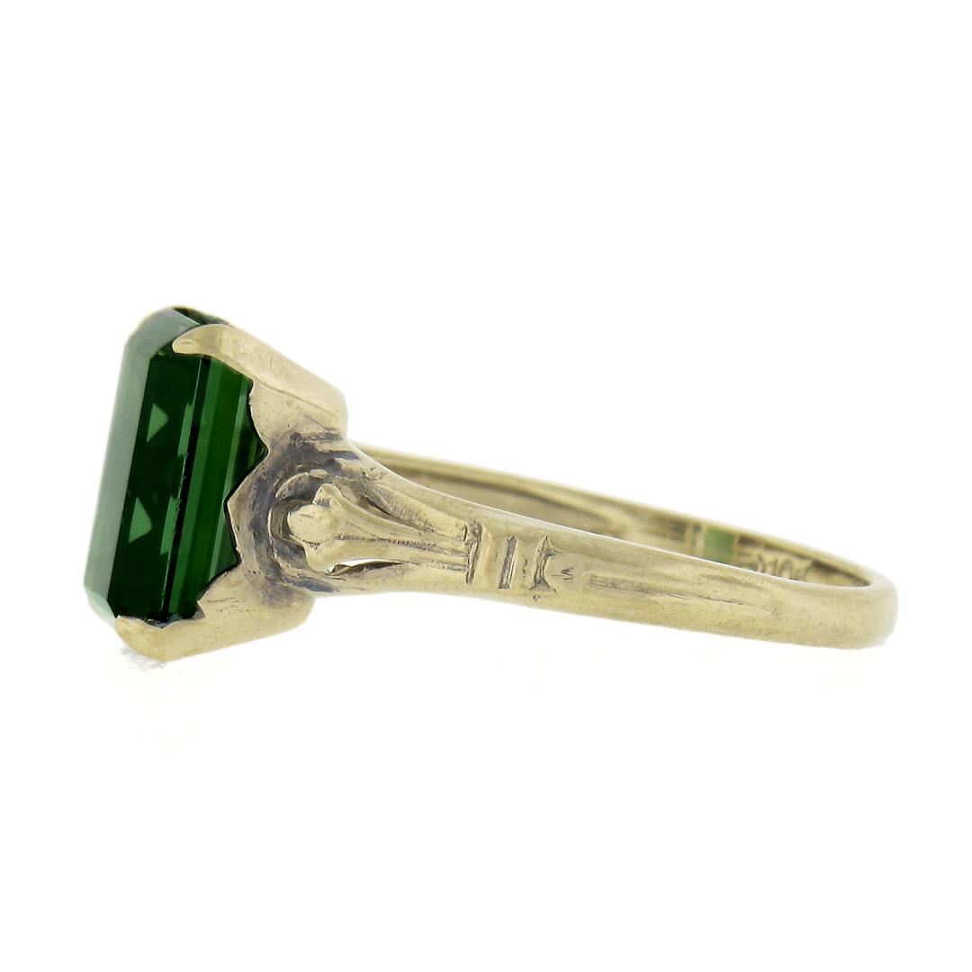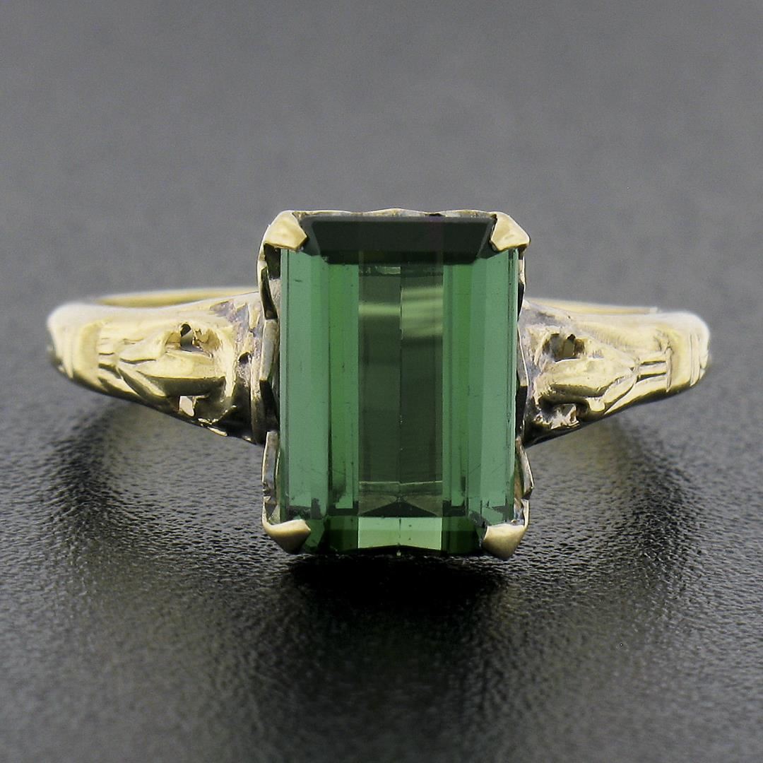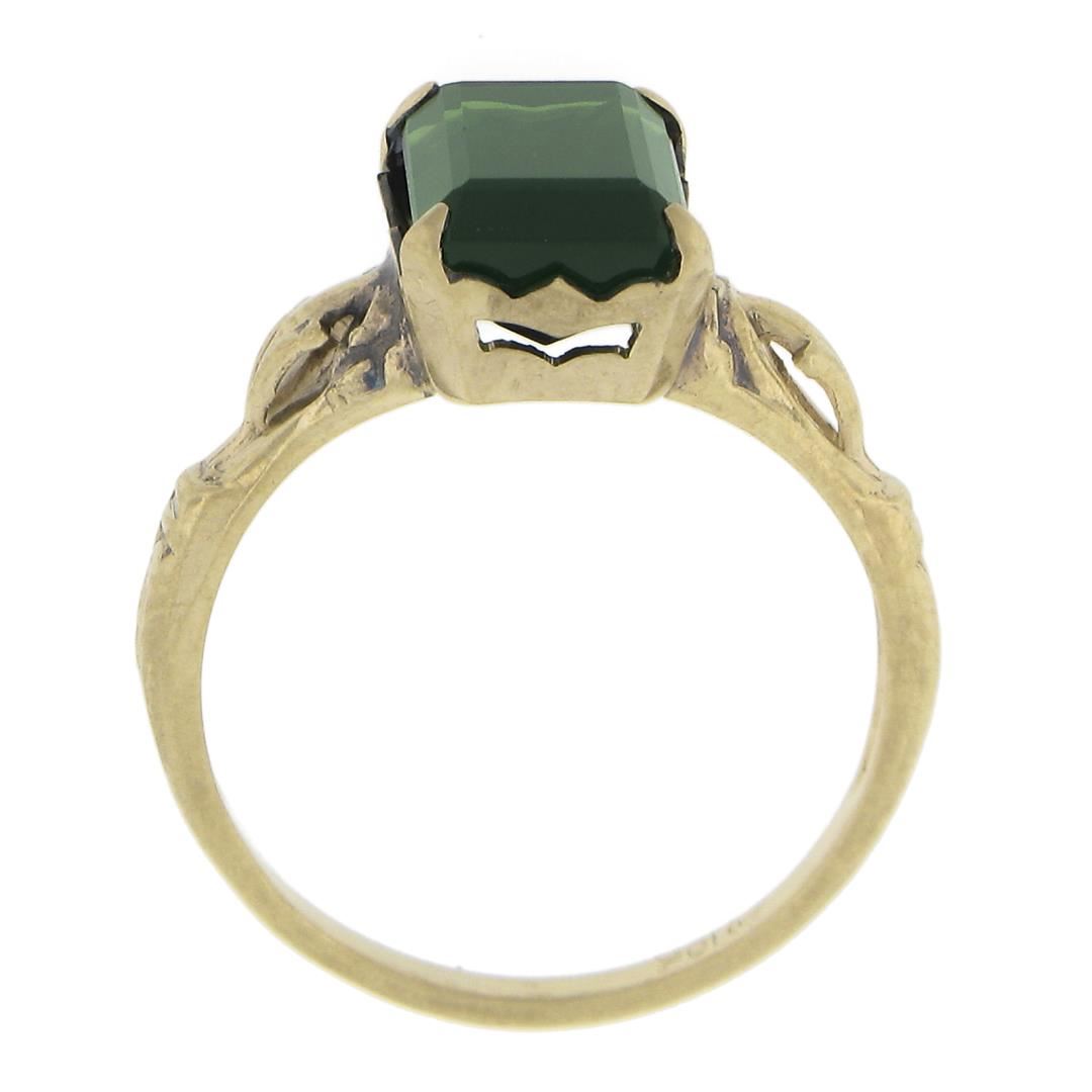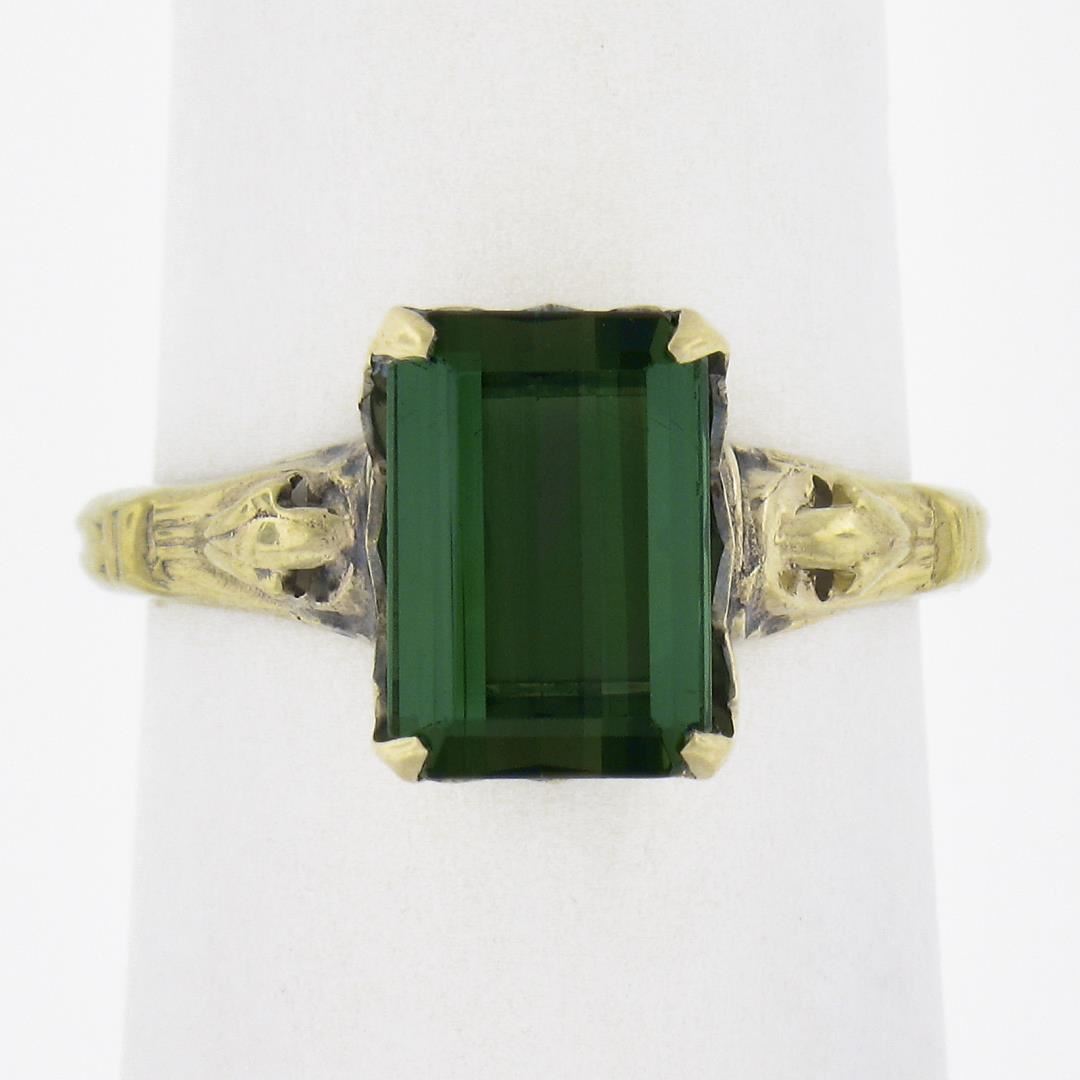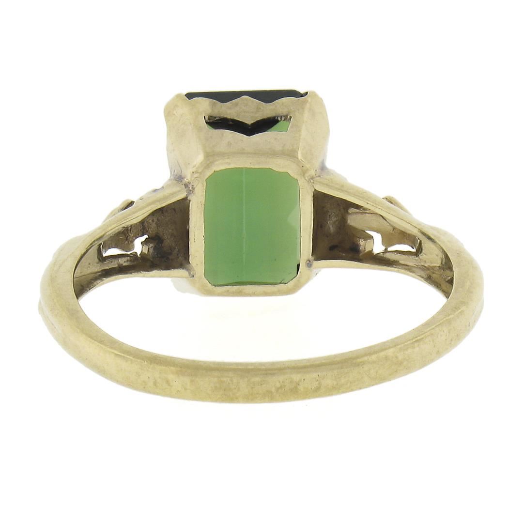A vintage solid 10k yellow gold ring, with 1 emerald cut natural tourmaline (2.64ct). The ring is size 6.5, weighs a total of 2.14 grams, and measures 9.8mm wide.