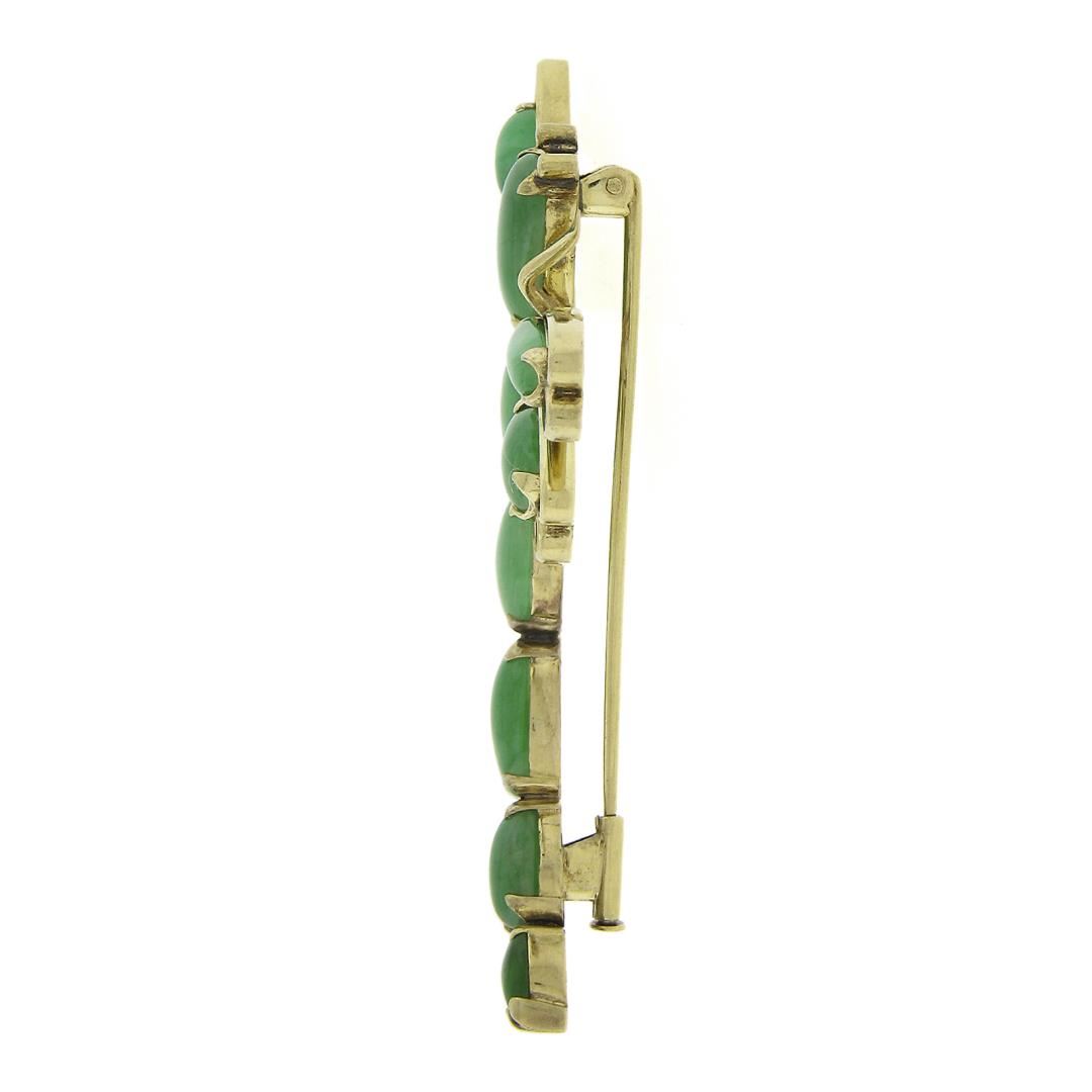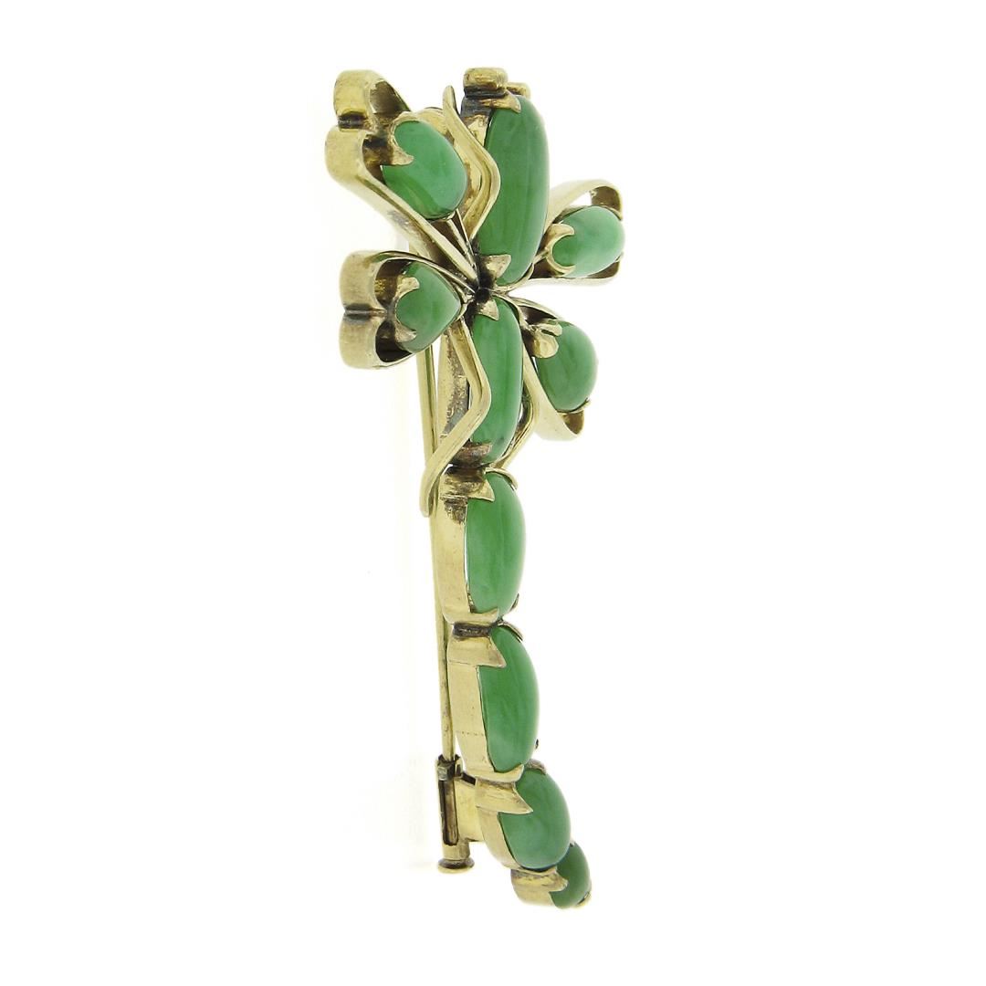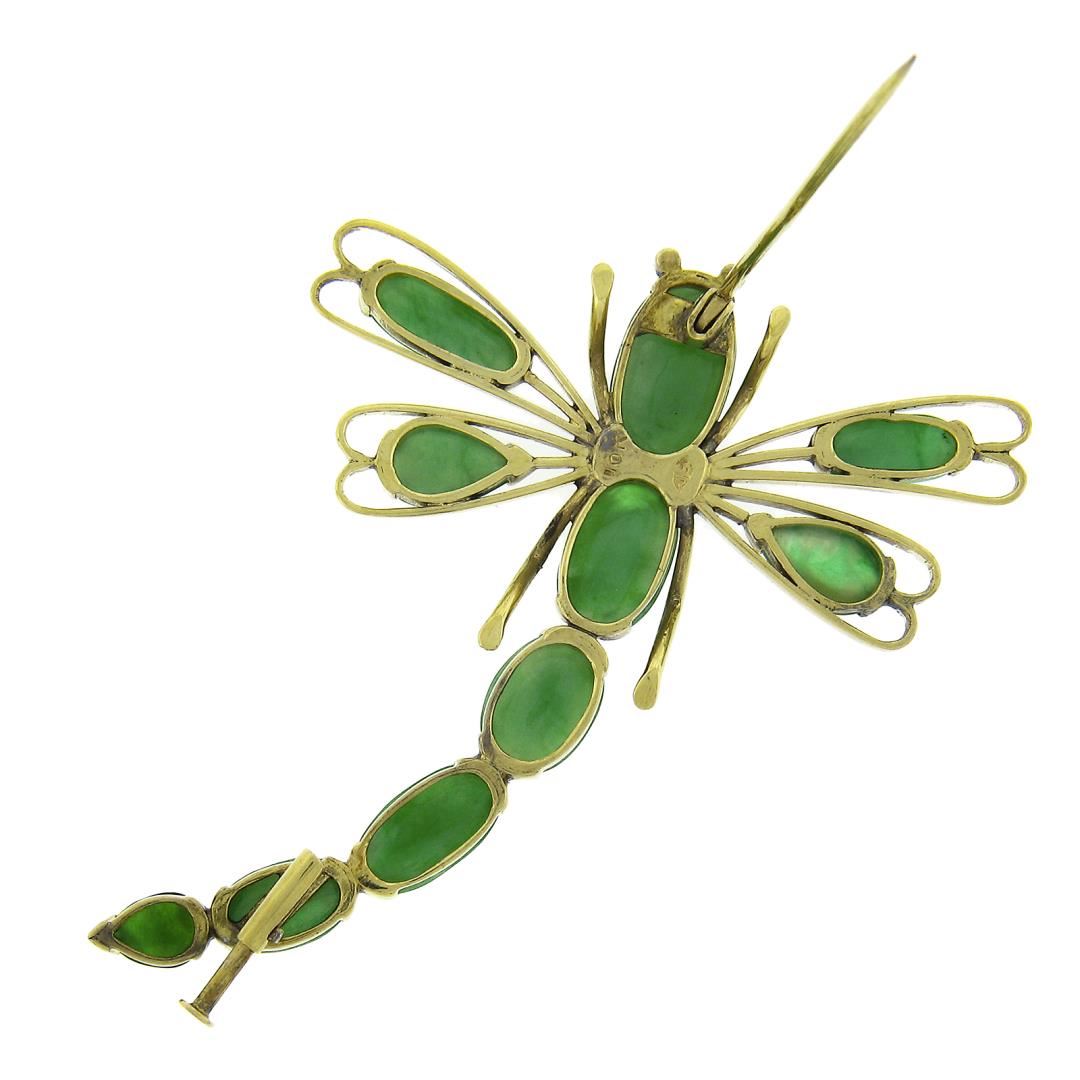 A vintage 10k yellow gold dragongly brooch, featuring 10 oval & pear cabochon cut natural jades. Measures 44.3x55.3mm and weighs a total of 10.82 grams.
