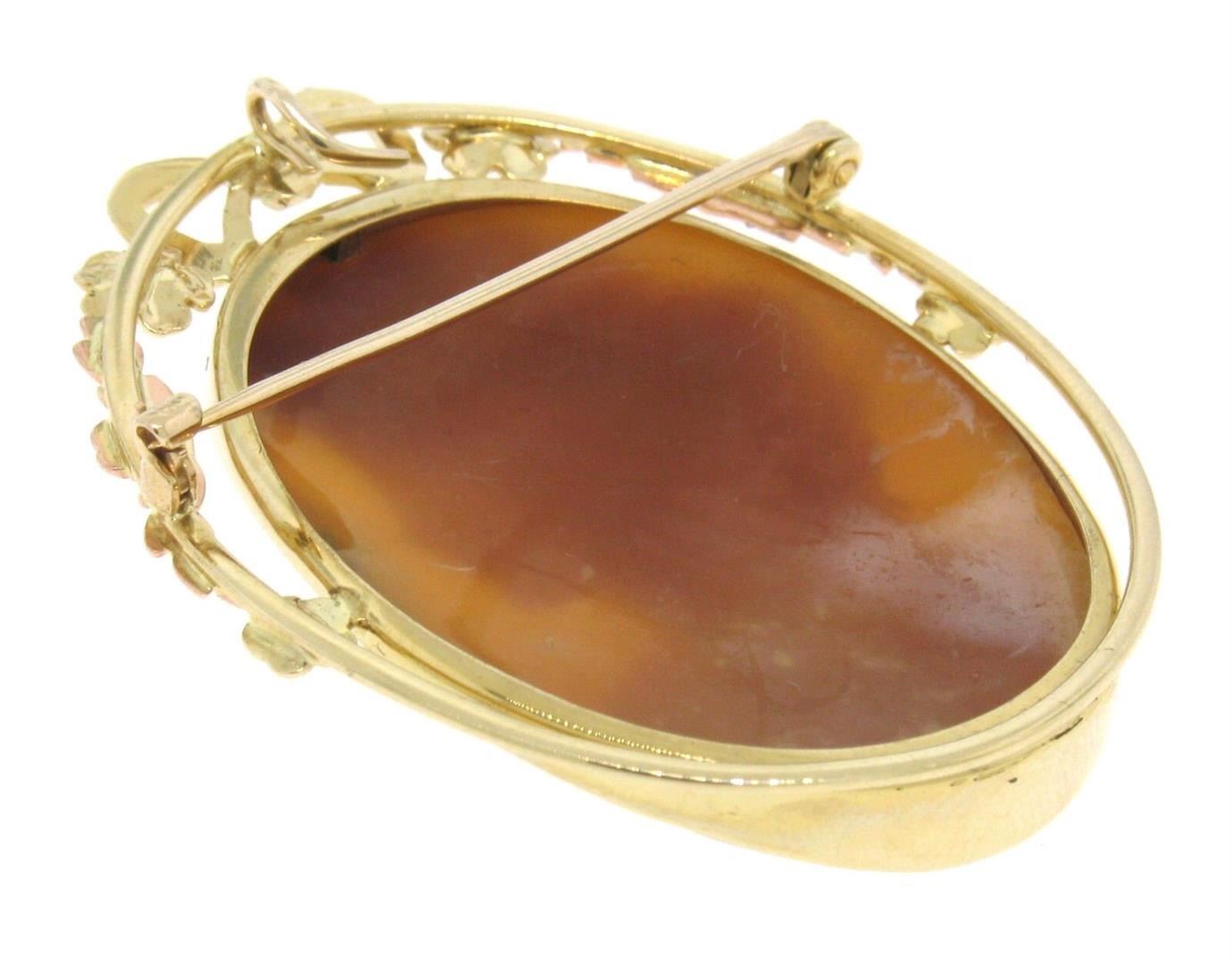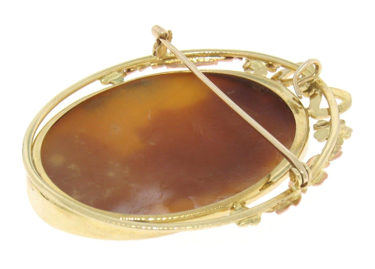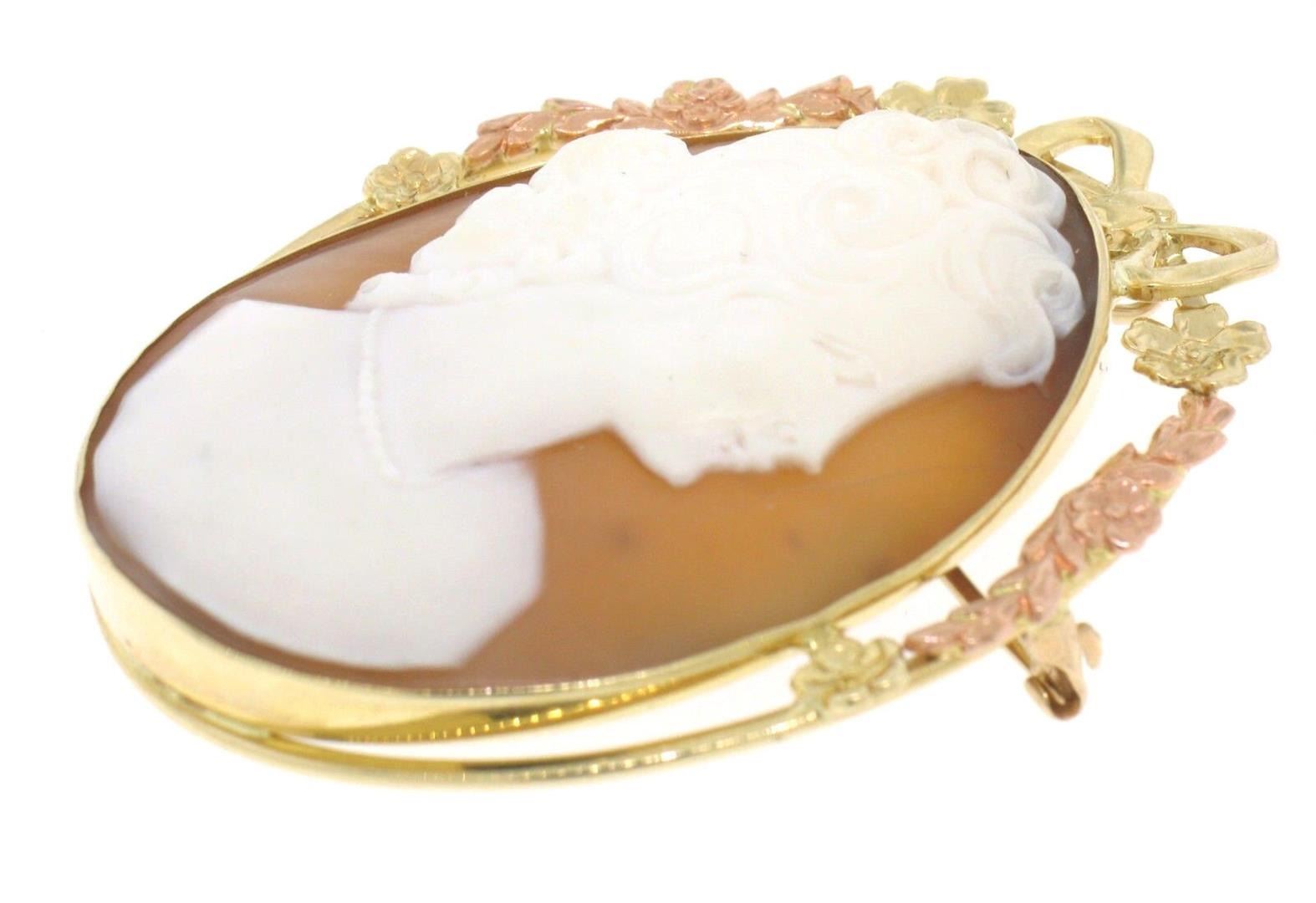a vintage solid 10k yellow and rose gold brooch, with 1 carved shell cameo (30.50x41.06mm). Measures 47.34x39.02mm and weighs a total of 10.90 grams.