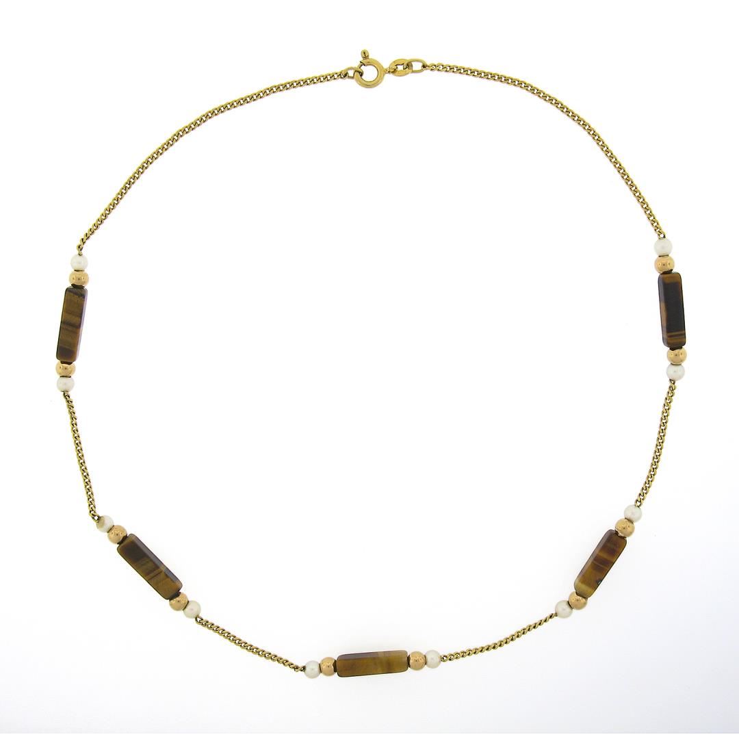 A vintage 10k yellow gold statian necklace, with 5 bar shape natural Tigers eye (14.6mm to 14.8mm), and 10 round shape cultured pearl (3.6mm ). It weighs a total of 6.42 grams, measures 1mm wide, and measures 15.5 inches in length.