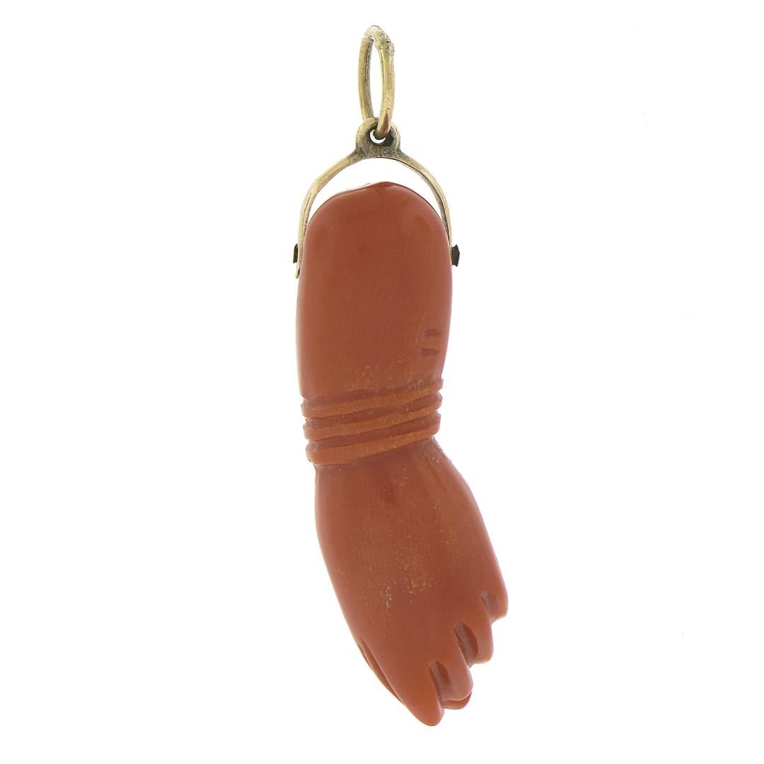 A vintage solid 10k rosy yellow gold figa hand pendant, with carved natural coral (31.3x9.6mm). The pendant weighs a total of 4.04 grams, measures 39.2x9.6mm including the bail, and the inside of the bail measures 4x5.2mm.